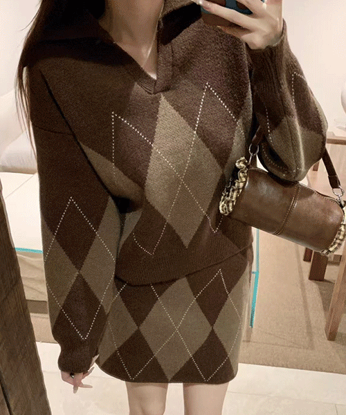 - Set - 체커 브이넥 니트 탑 스커트 투피스 세트( 리뷰 : 0 )