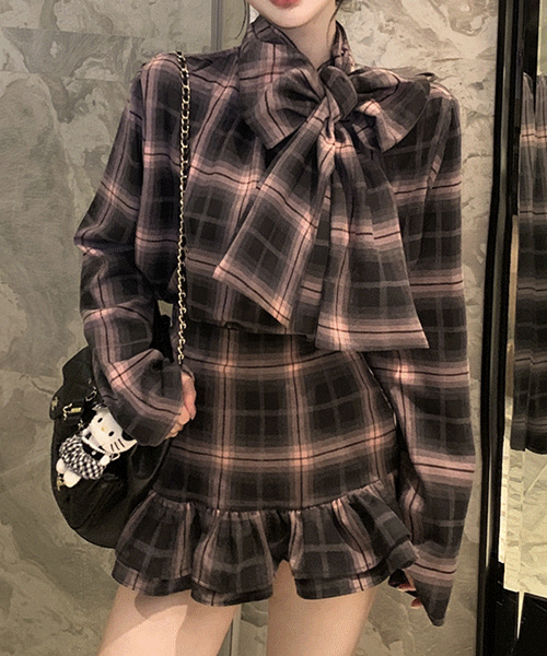 - Set / 플란넬 체크 하프넥 탑 프릴 스커트 투피스 세트 / 스카프 타이 포함( 리뷰 : 0 )