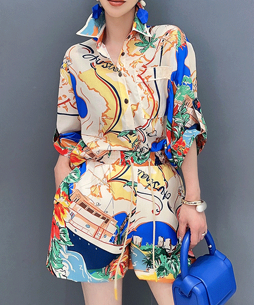 - Set - 마르소 노블 패턴 박시 셔츠 밴딩 숏팬츠 투피스 세트( 리뷰 : 0 )