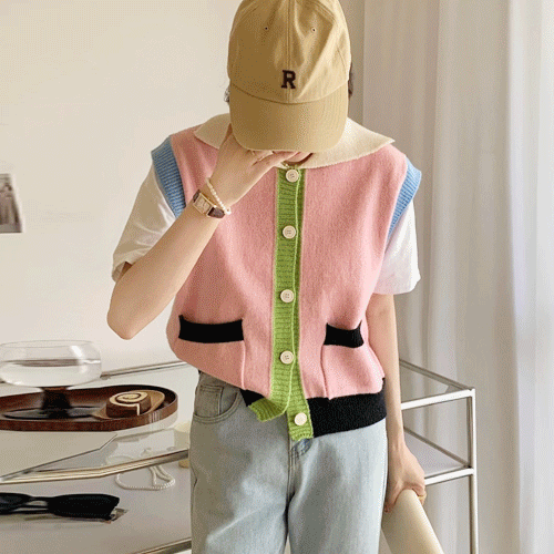 - 마카롱 컬러배색 니트 조끼 가디건( 리뷰 : 0 )