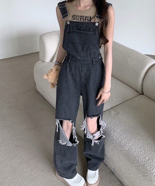 메이슨 해짐 데미지 흑청 멜빵 데님 팬츠 - 빅사이즈 4XL까지