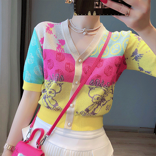 특가 / 아를로 비비드 컬러 배색 써머 니트 반팔 가디건