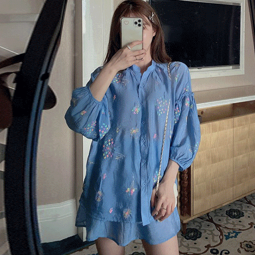 무료배송 / 아모리노 민들레 꽃자수 볼륨 루즈핏 블라우스 스커트 투피스 세트