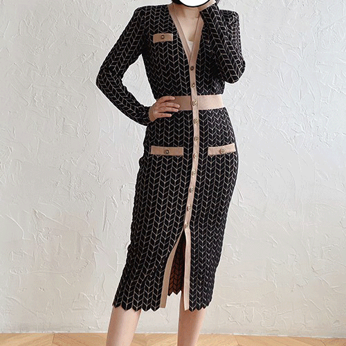 국내배송 / 애덤스 기하학패턴 오피스 미디 니트 원피스