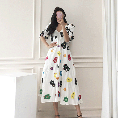 무료배송 / 베니아 꽃자수 볼륨소매 린넨 롱원피스
