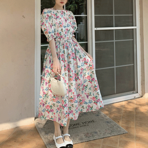 국내배송 / 앨리스 핑크플라워 볼륨 밴딩 롱원피스
