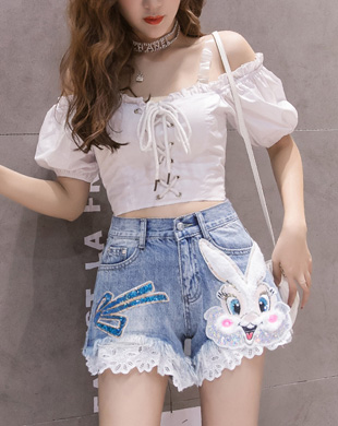 - [2XL까지] 깜찍 토끼 레이스 스팽글 데님 팬츠 / 청반바지, 데님반바지, 스팽글반바지, 스팽글바지, 데님스커트, 홍콩수입원피스, 홍콩수입보세