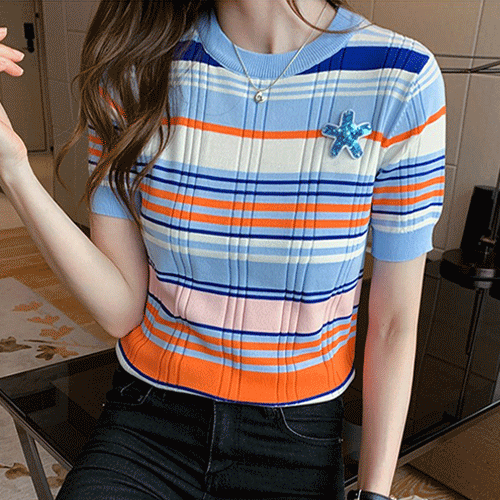국내배송 / 플리타 블루 배색 여름 반팔 니트