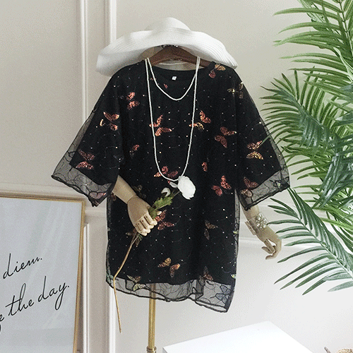 국내배송 / 렛잇고 이중 시스루 망사 오버핏 롱티셔츠