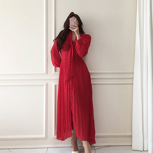 무료배송 / 레드홀릭 리본 플리츠 롱원피스