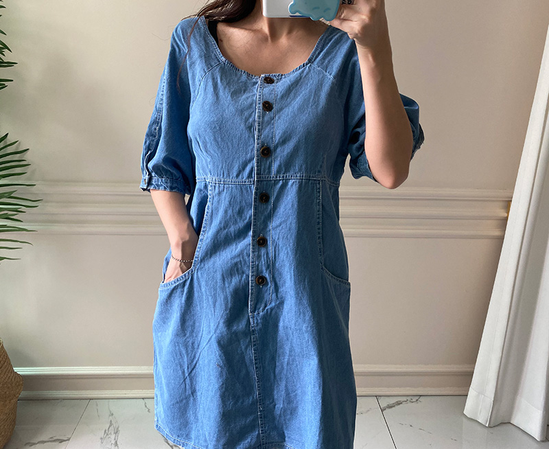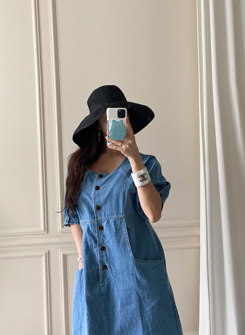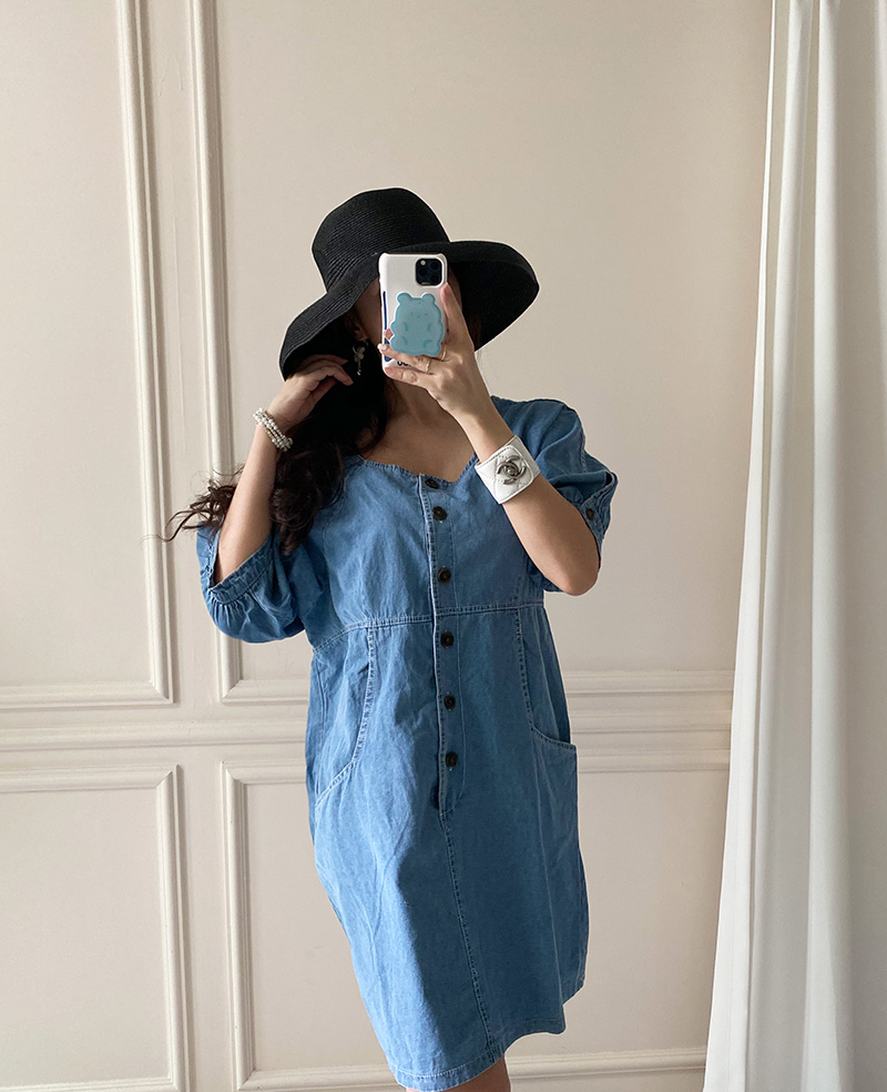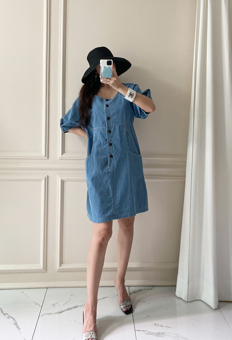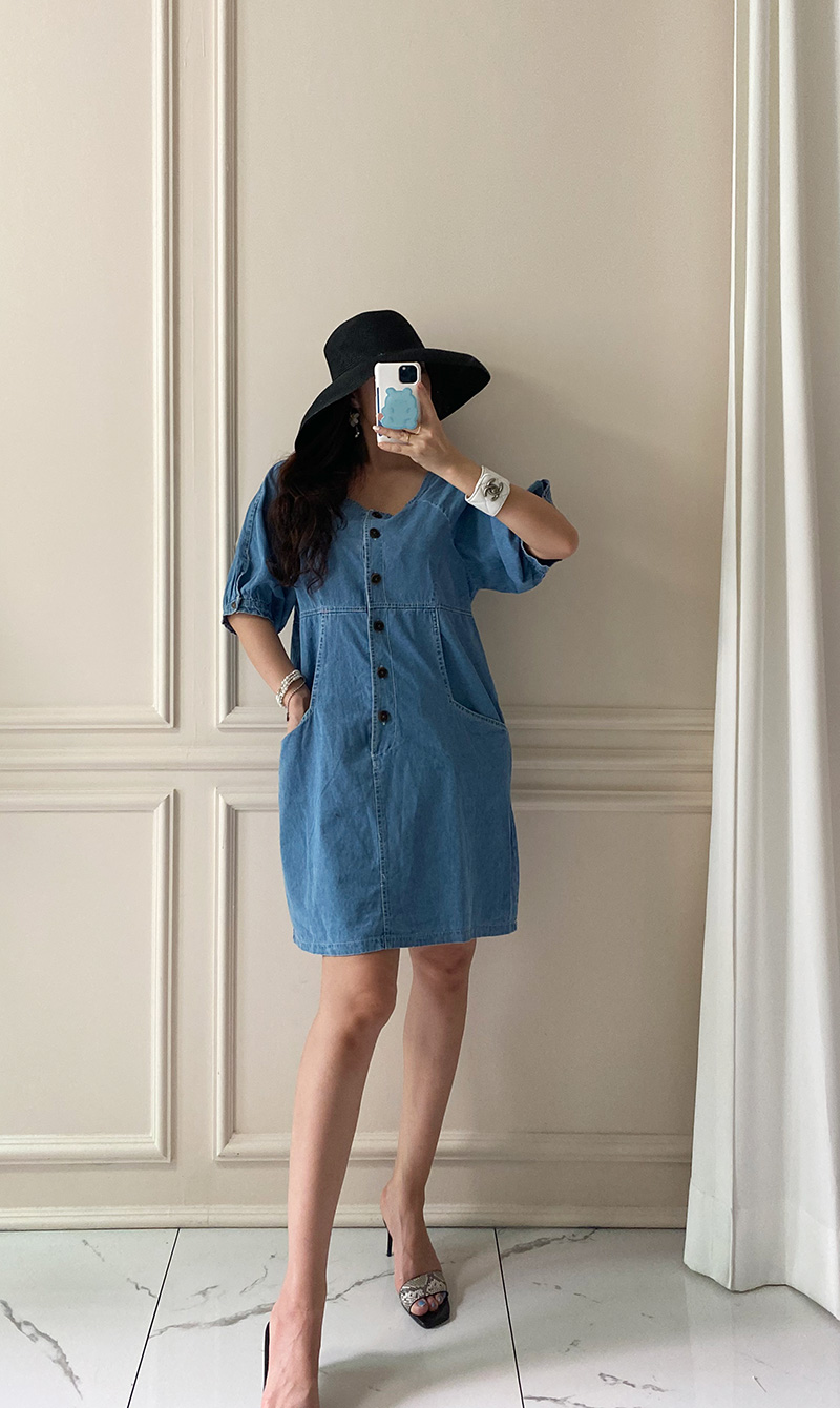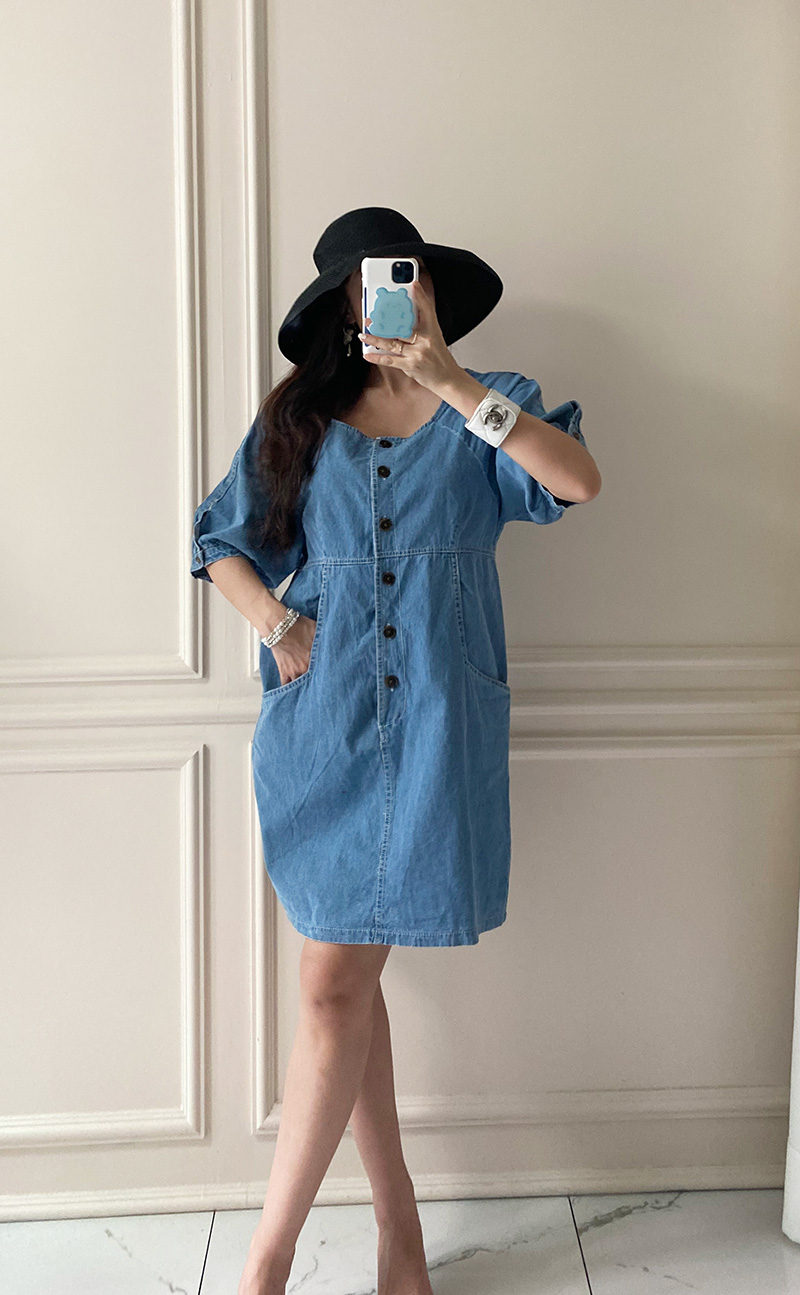 국내배송 / 로모네 볼륨소매 버튼 루즈핏 청 원피스