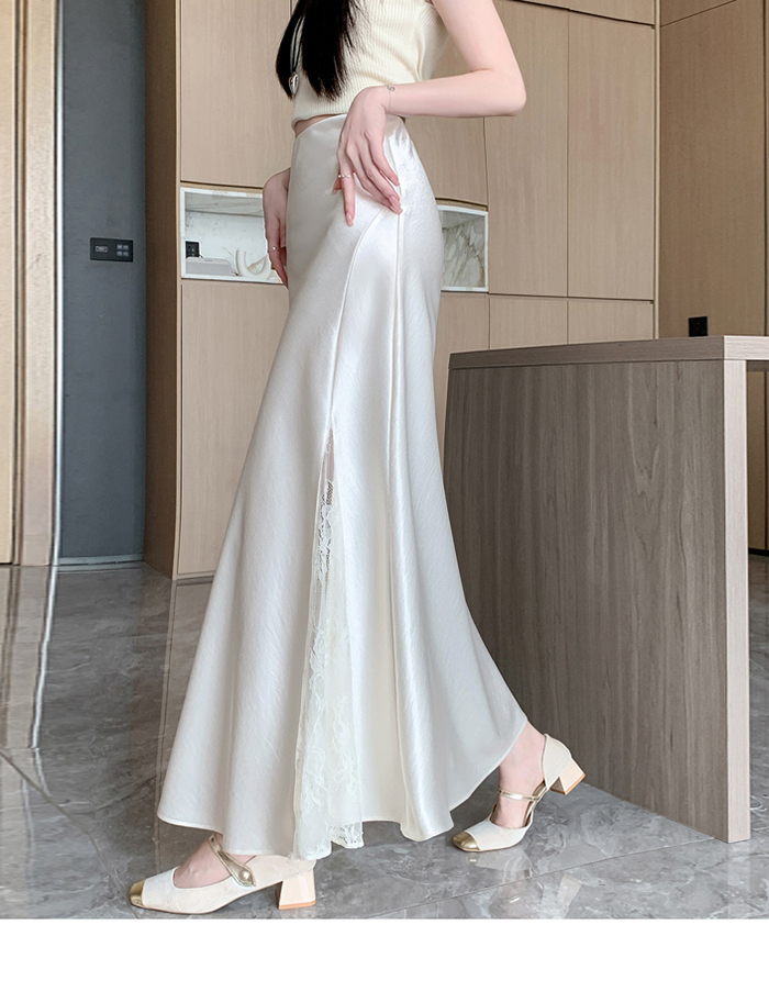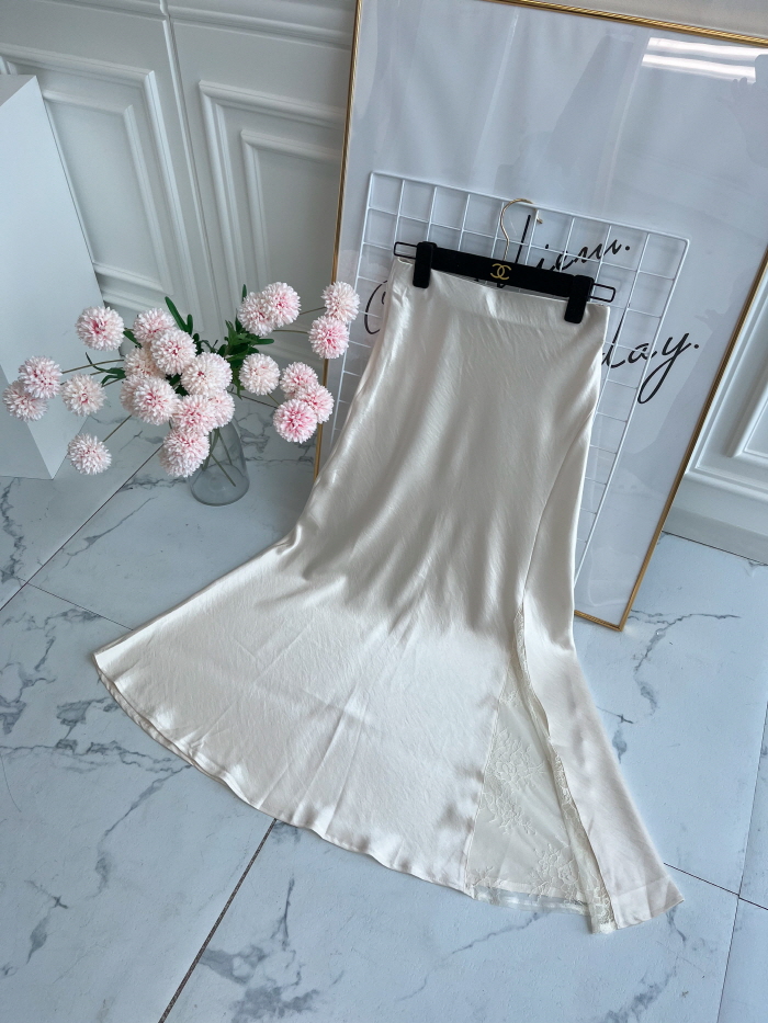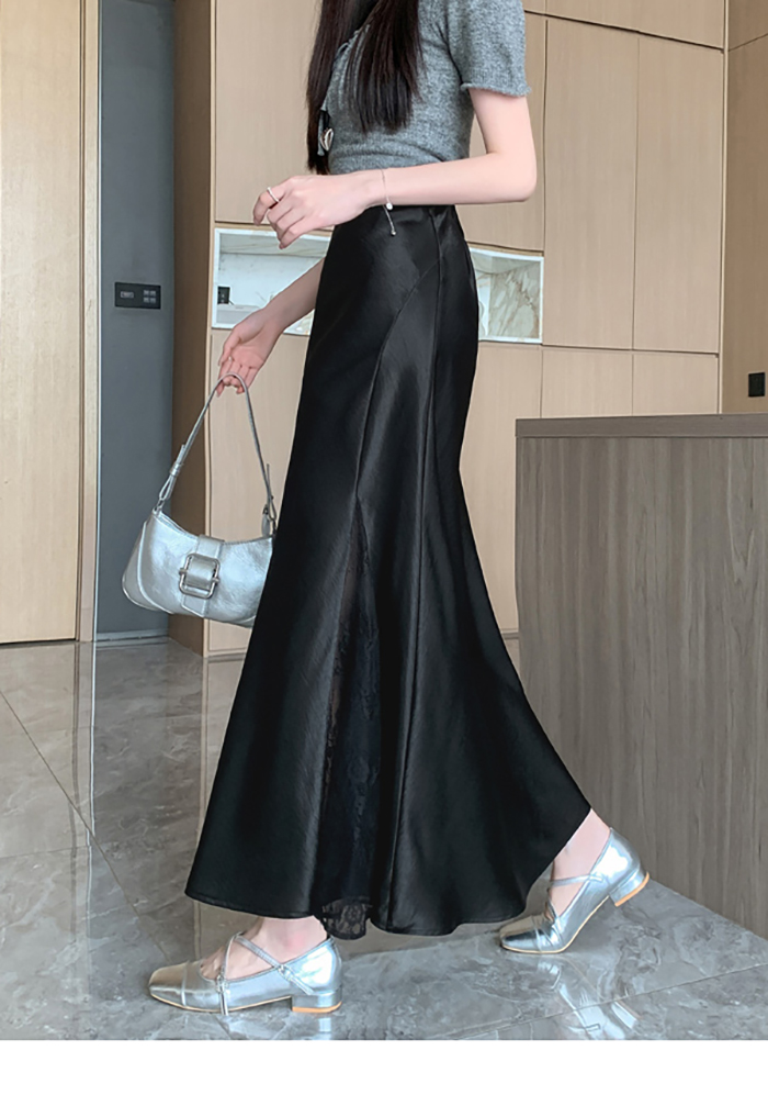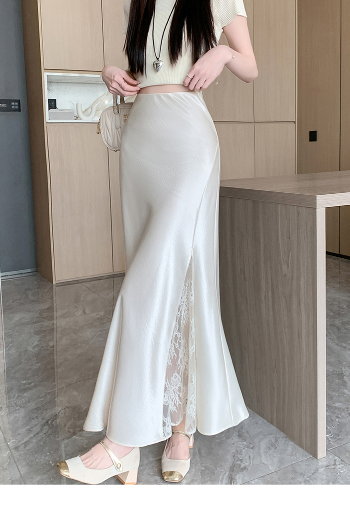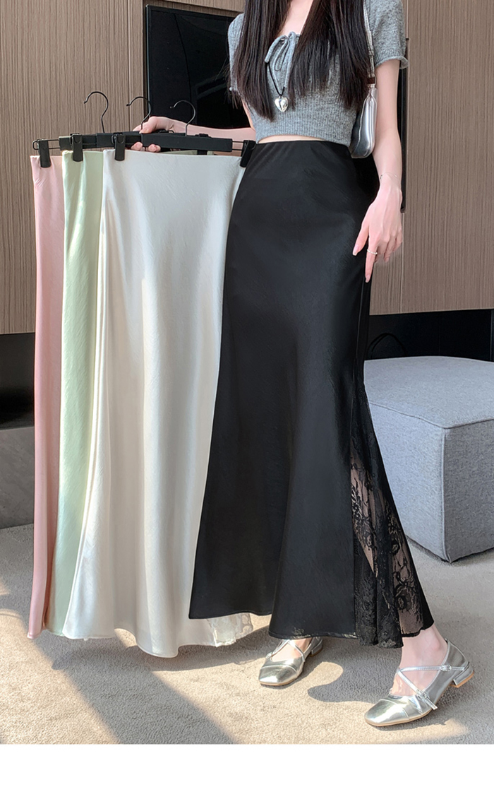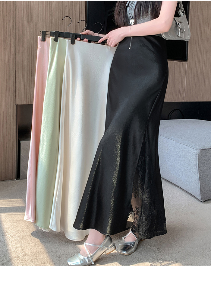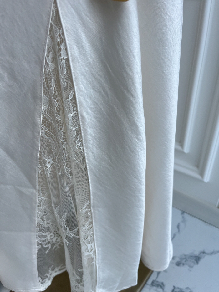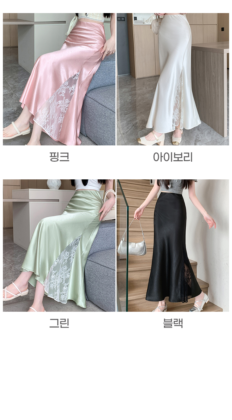 움직일 때마다 은은하게 반짝이는 새틴 소재와사이로 살짝 드러나는 시스루 레이스 포인트.하체를 자연스럽게 감싸주는 피쉬테일 라인으로다리는 더 길고, 라인은 더 날씬해 보여요.