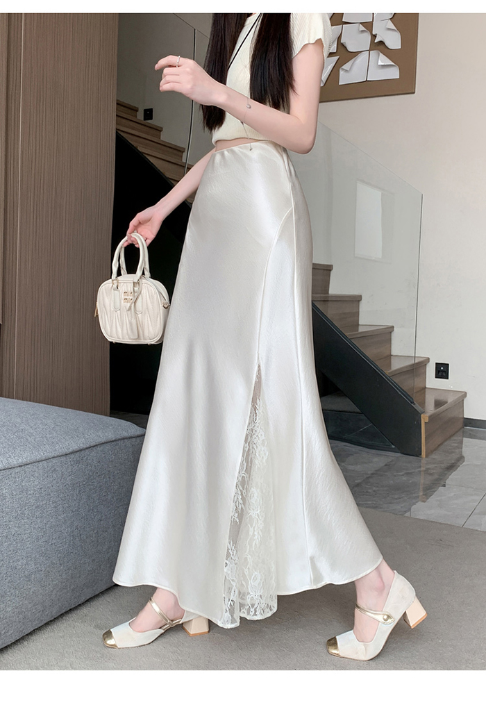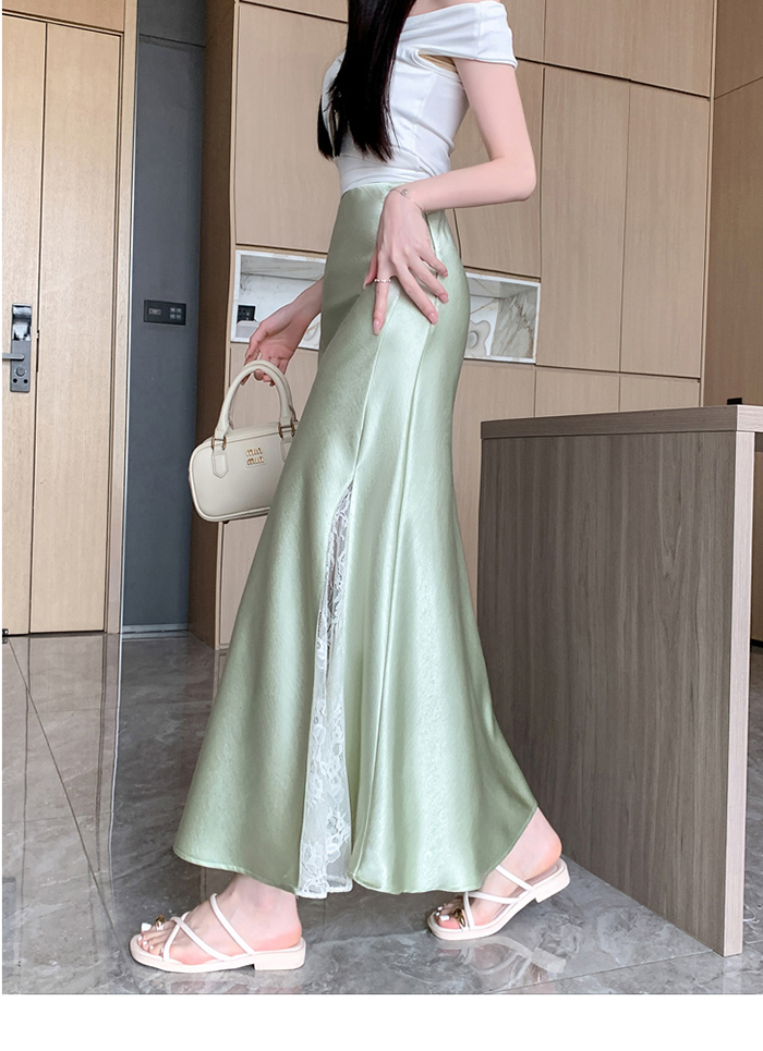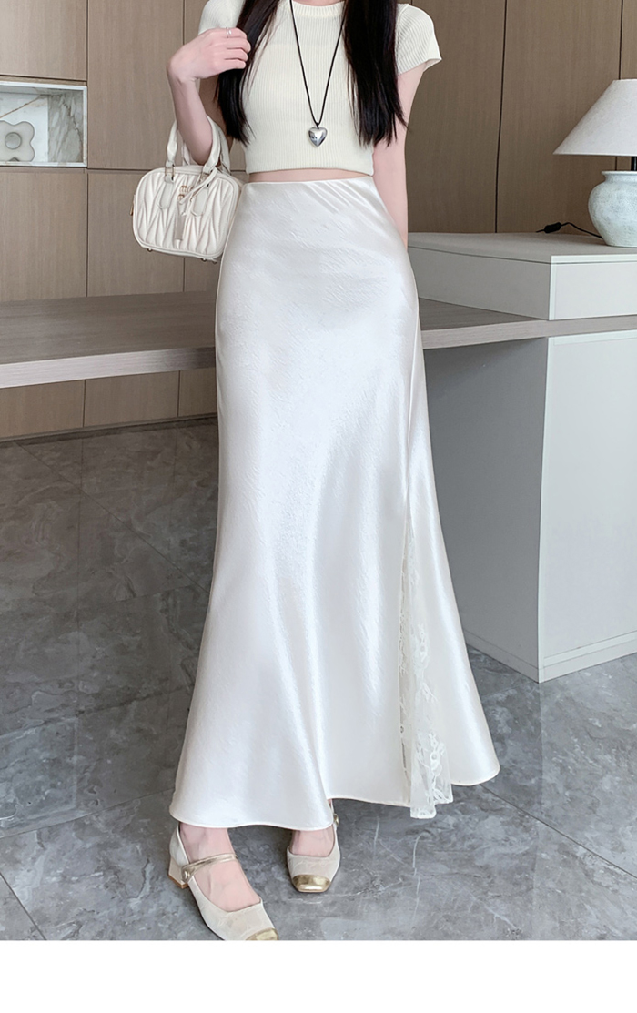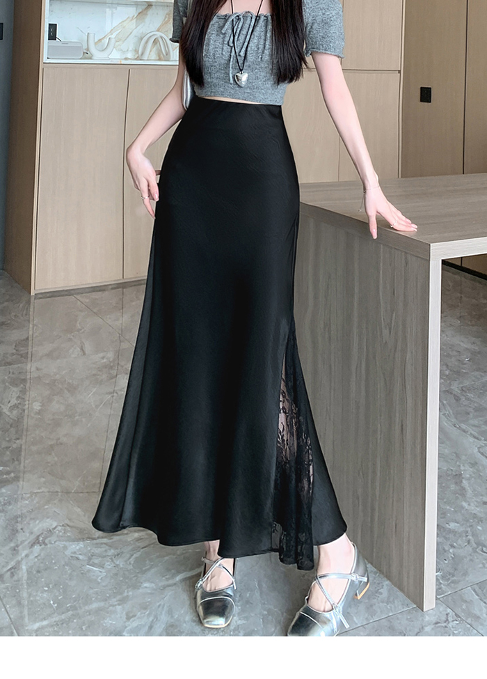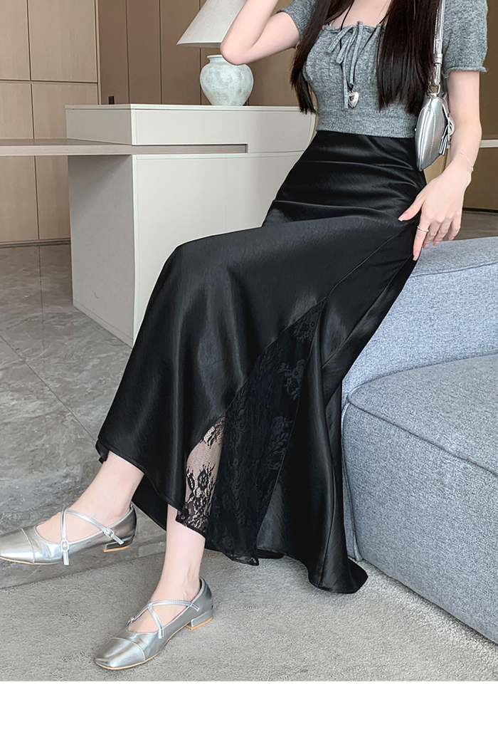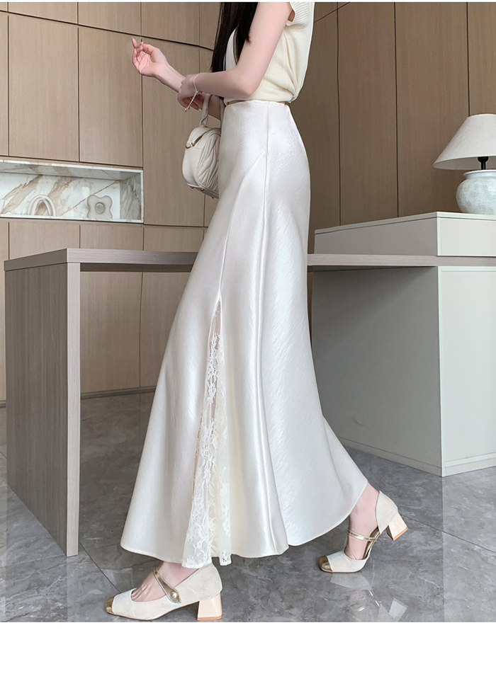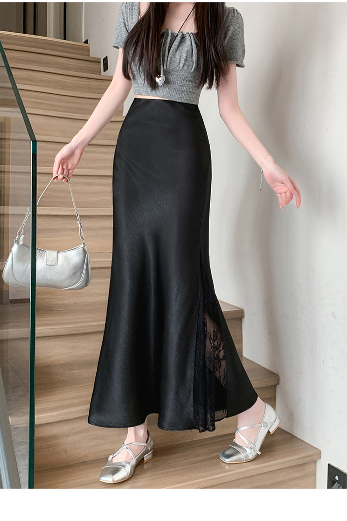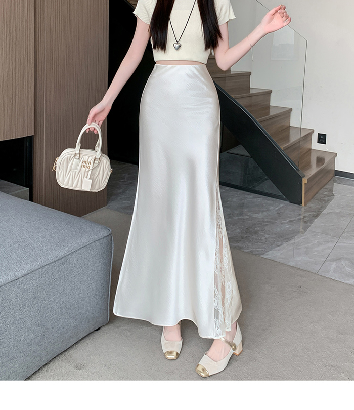 움직일 때마다 은은하게 반짝이는 새틴 소재와사이로 살짝 드러나는 시스루 레이스 포인트.하체를 자연스럽게 감싸주는 피쉬테일 라인으로다리는 더 길고, 라인은 더 날씬해 보여요.