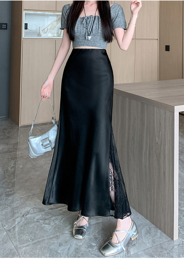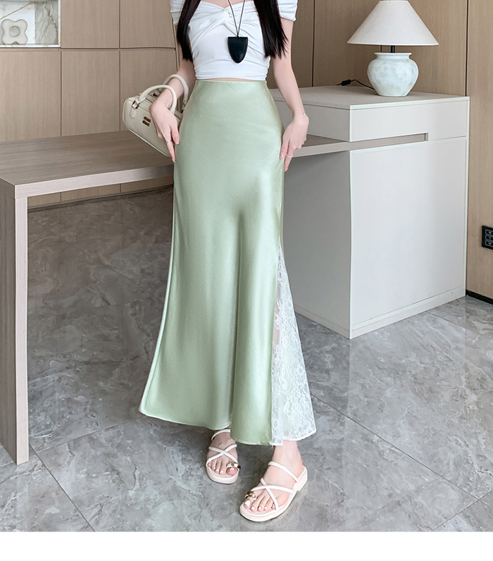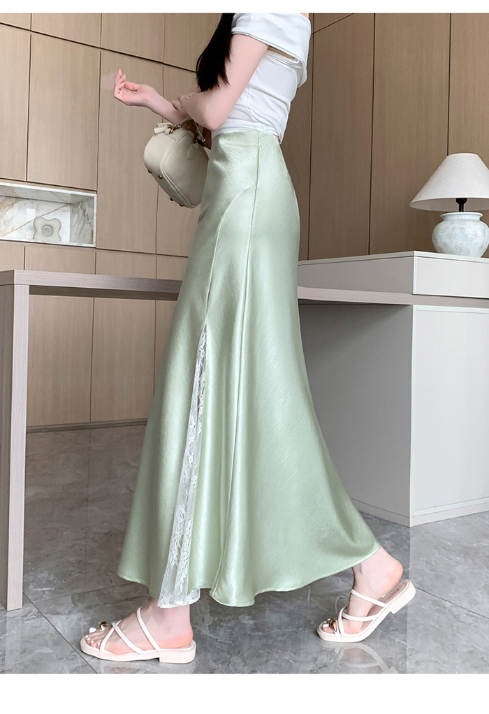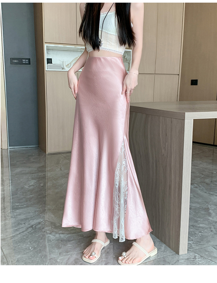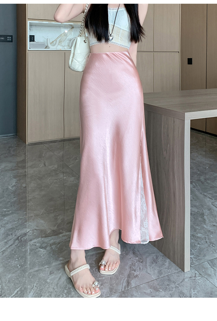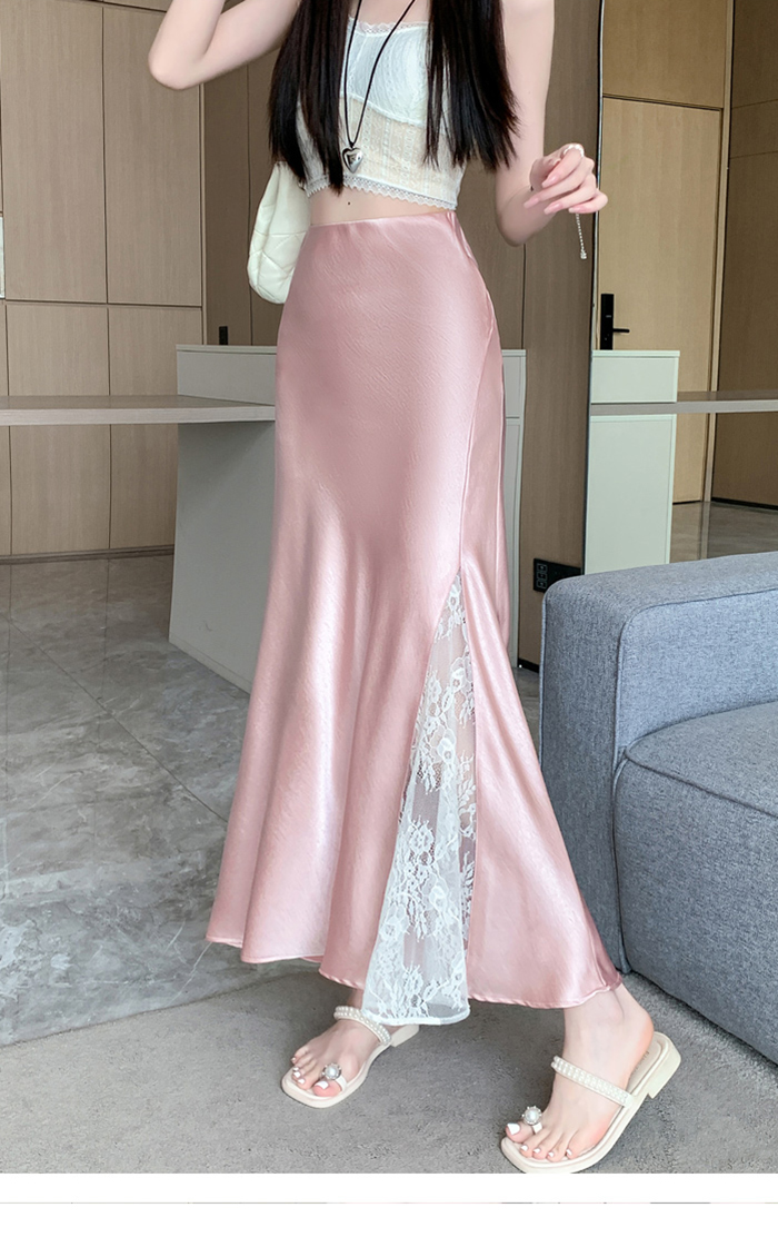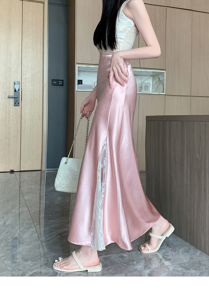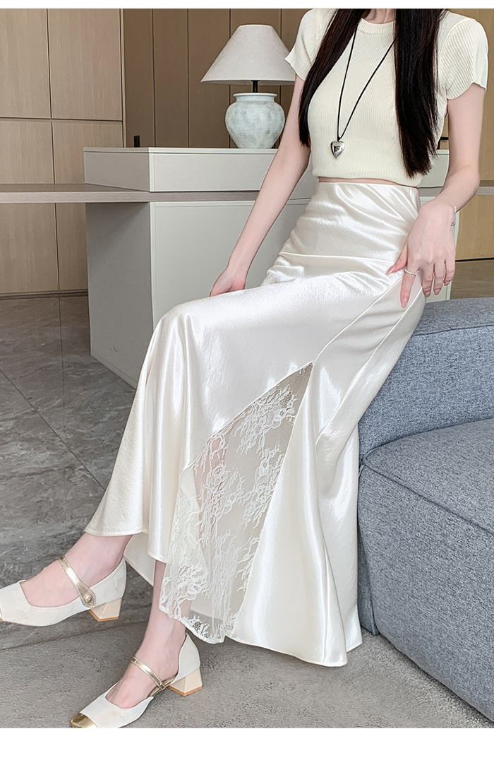 움직일 때마다 은은하게 반짝이는 새틴 소재와사이로 살짝 드러나는 시스루 레이스 포인트.하체를 자연스럽게 감싸주는 피쉬테일 라인으로다리는 더 길고, 라인은 더 날씬해 보여요.