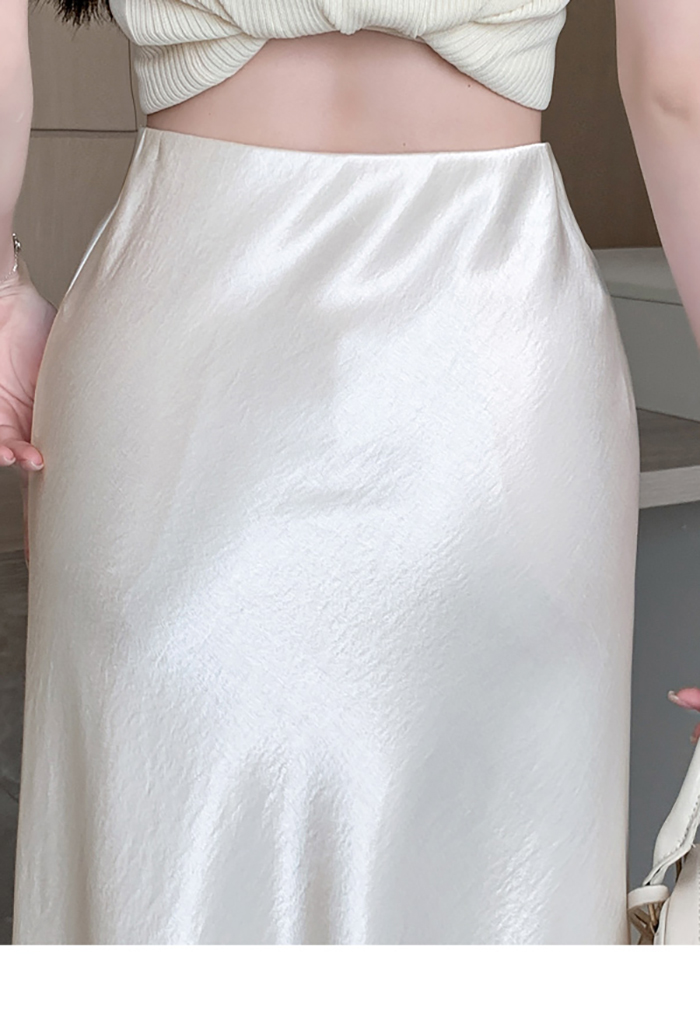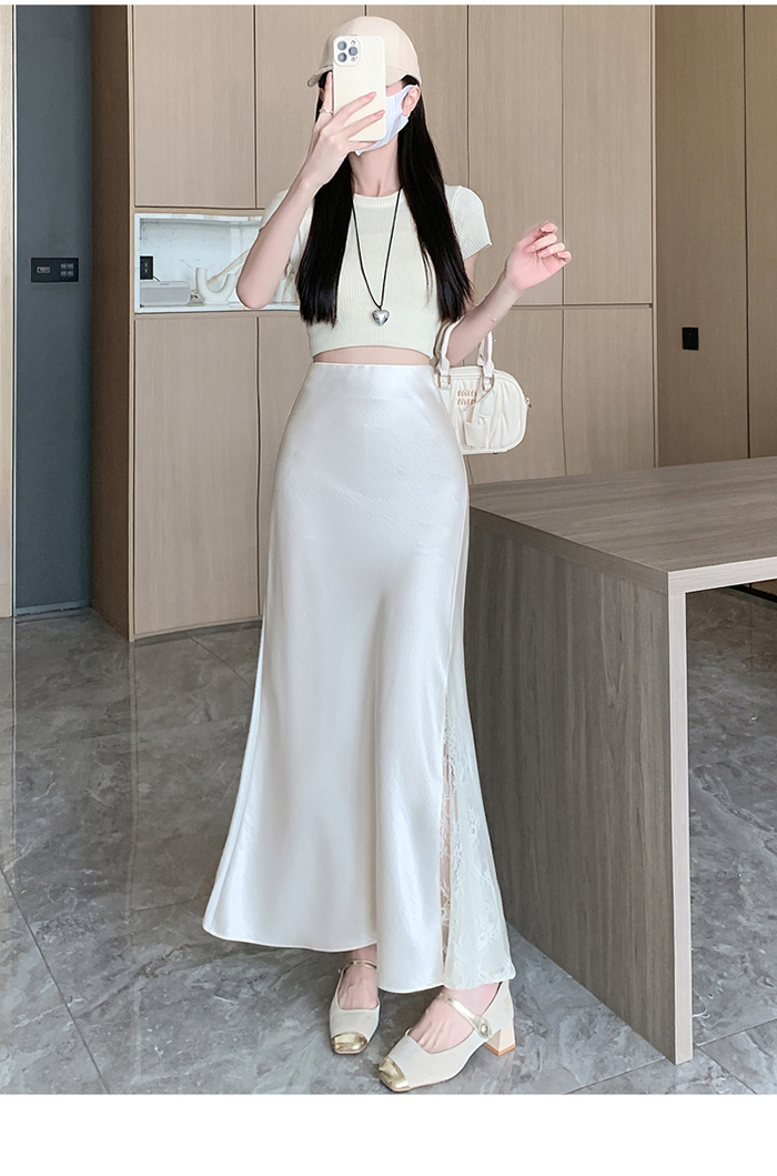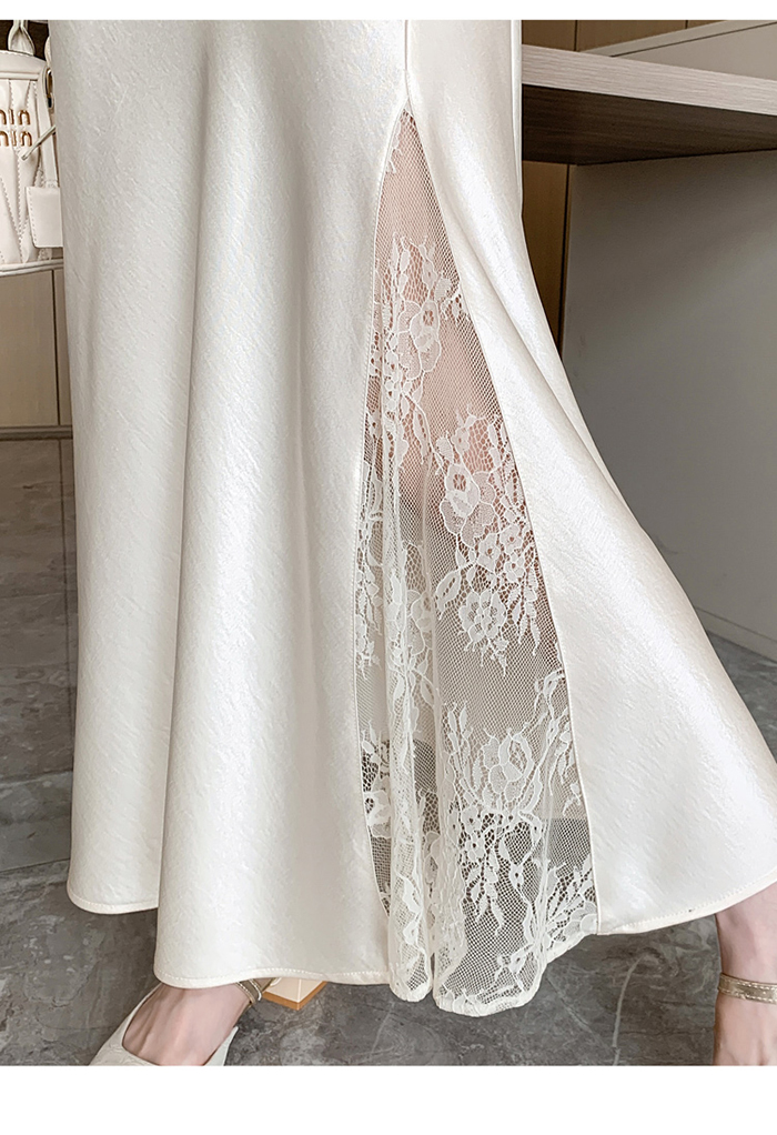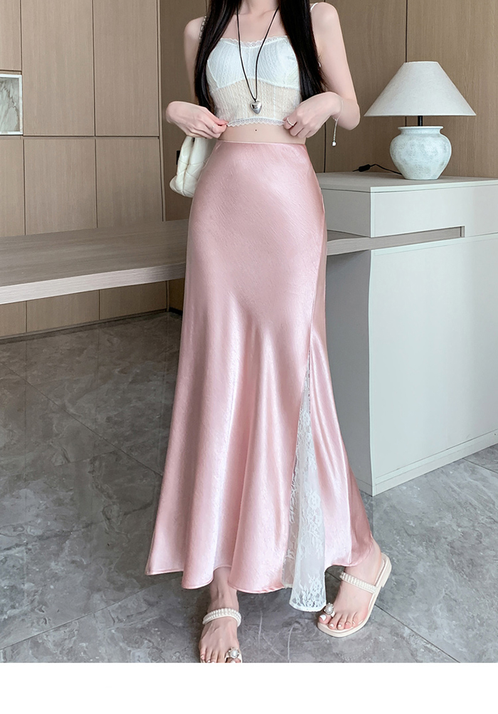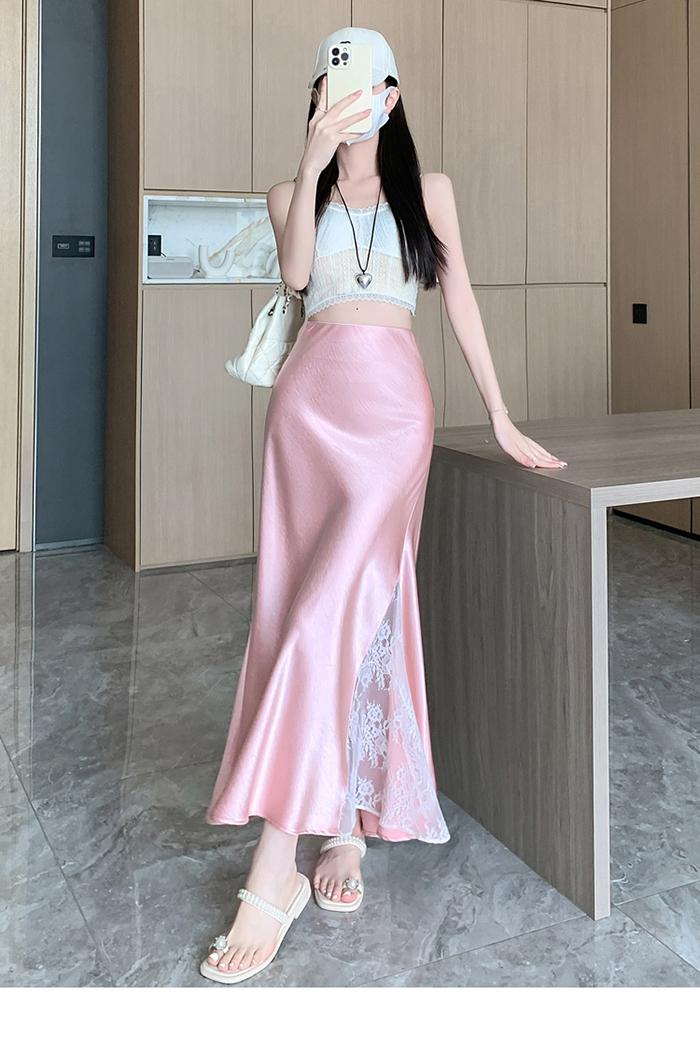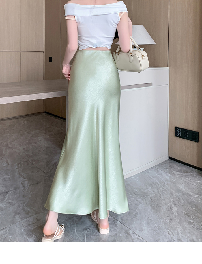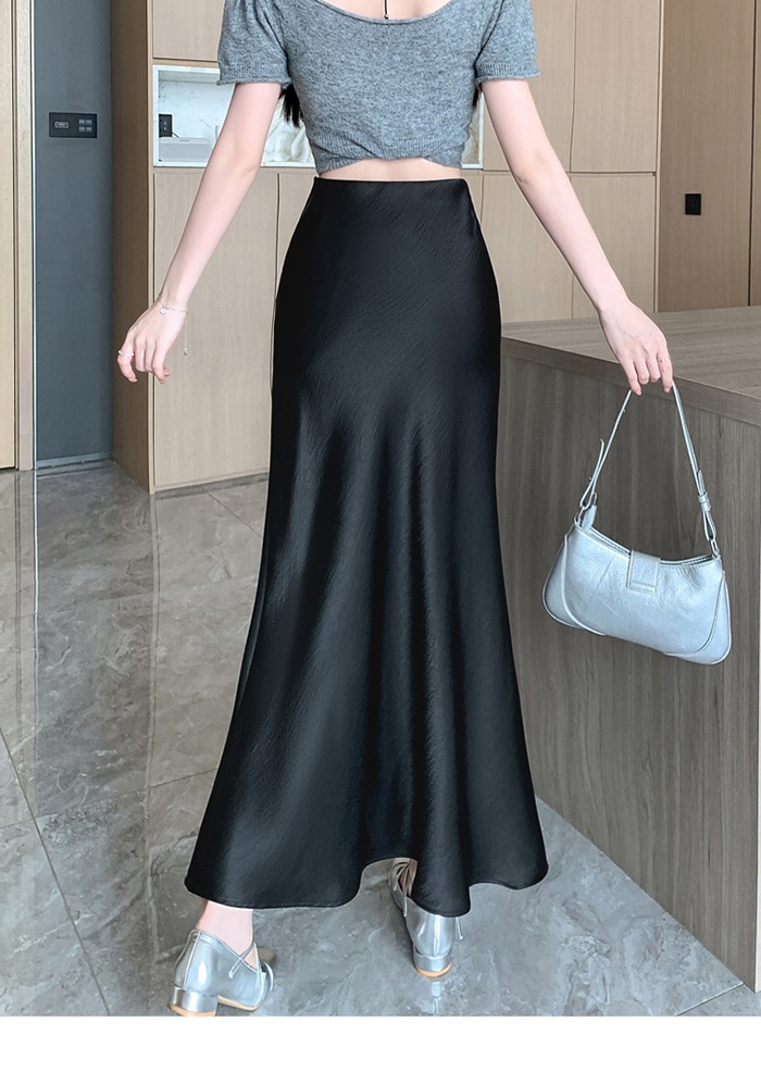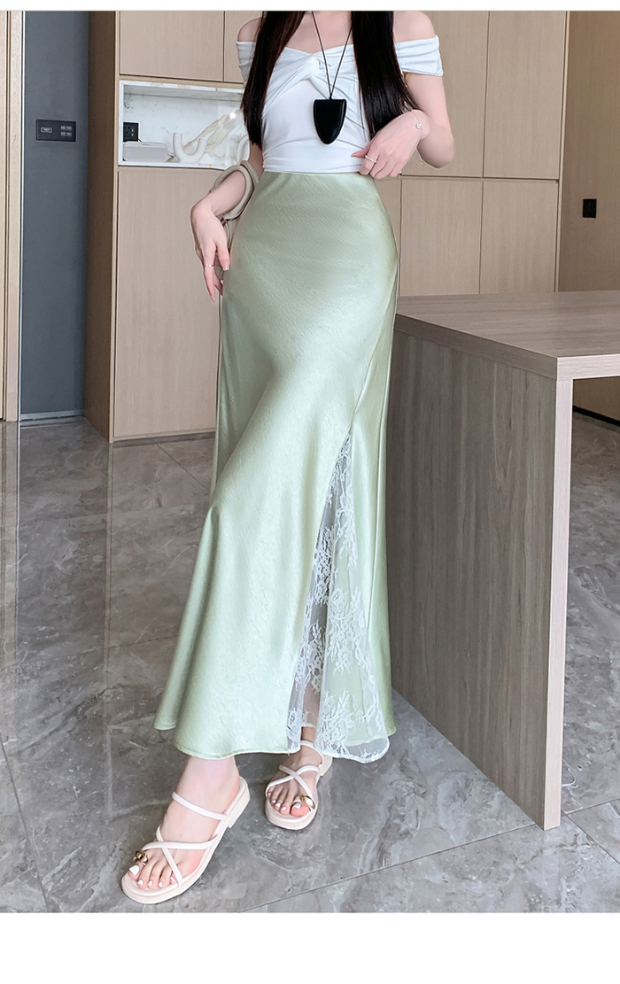 움직일 때마다 은은하게 반짝이는 새틴 소재와사이로 살짝 드러나는 시스루 레이스 포인트.하체를 자연스럽게 감싸주는 피쉬테일 라인으로다리는 더 길고, 라인은 더 날씬해 보여요.