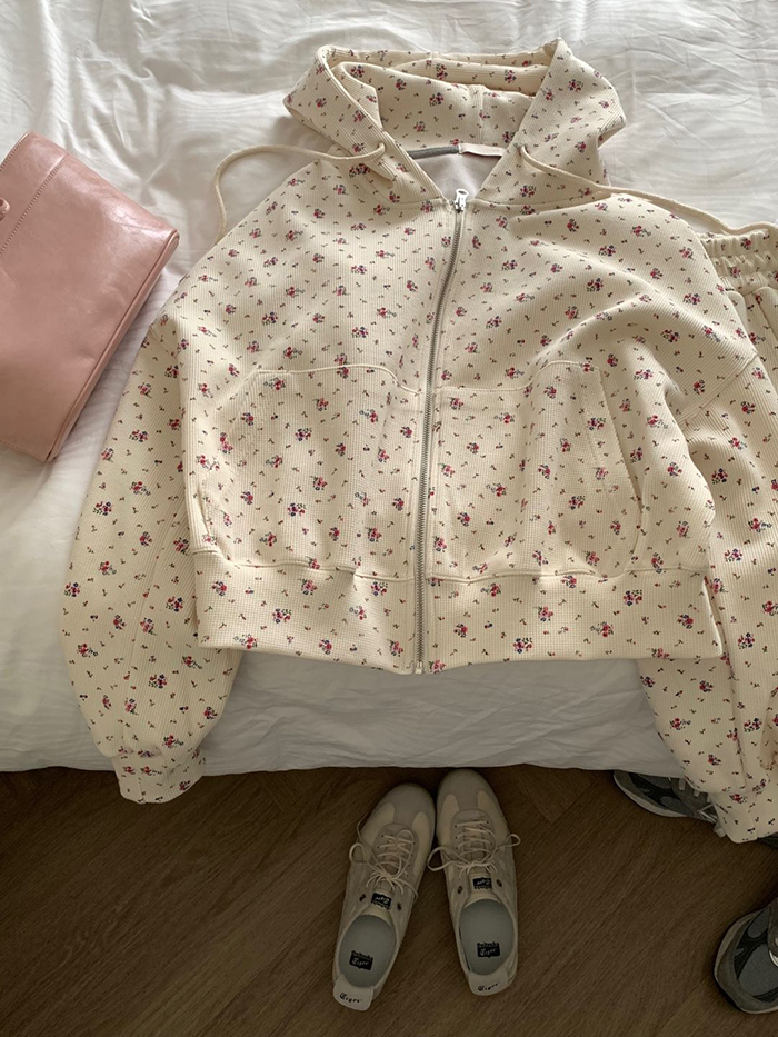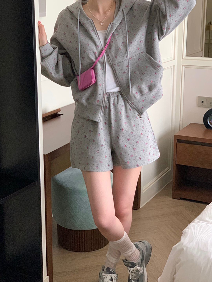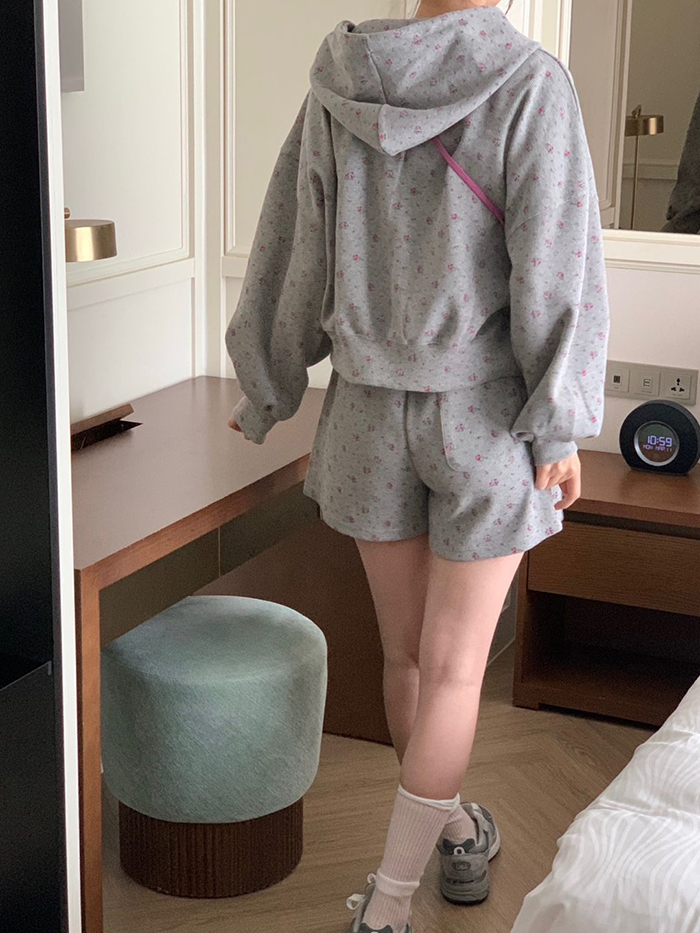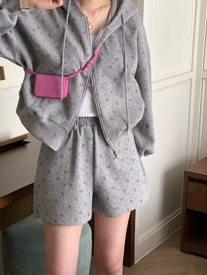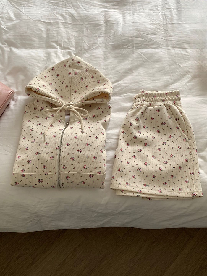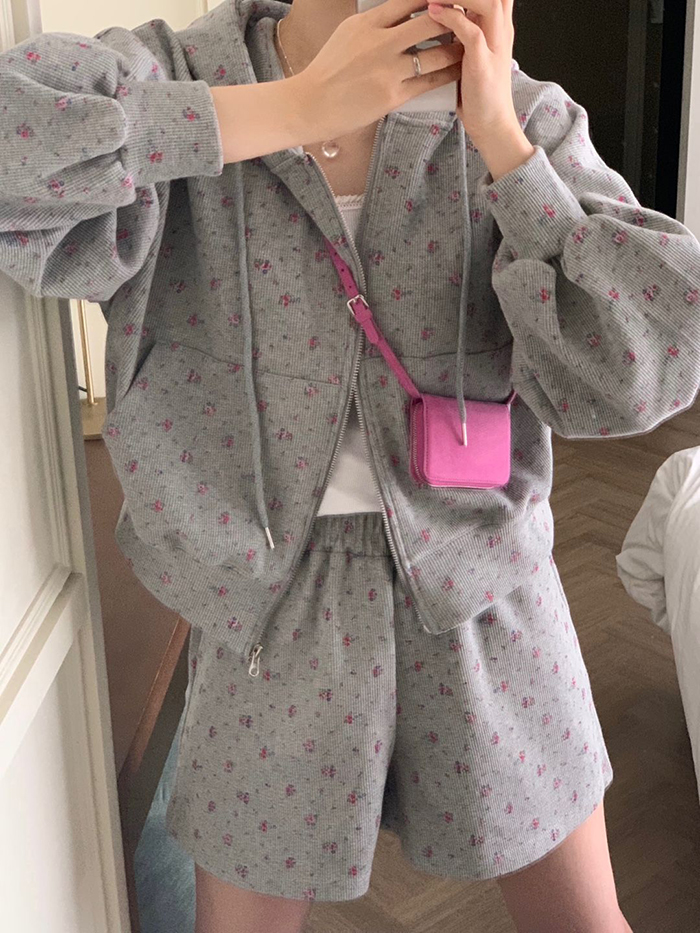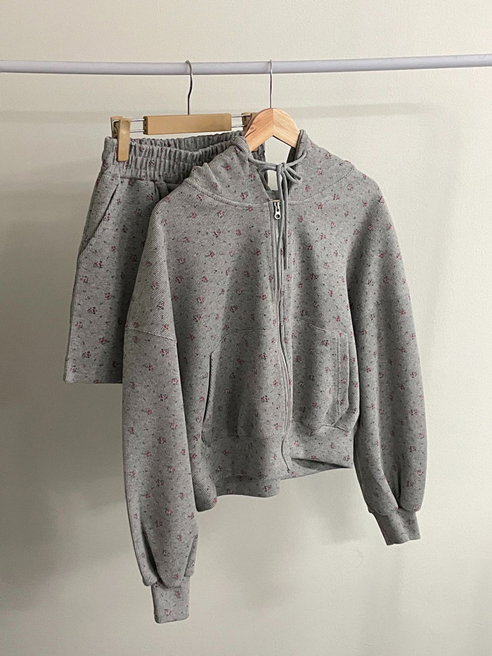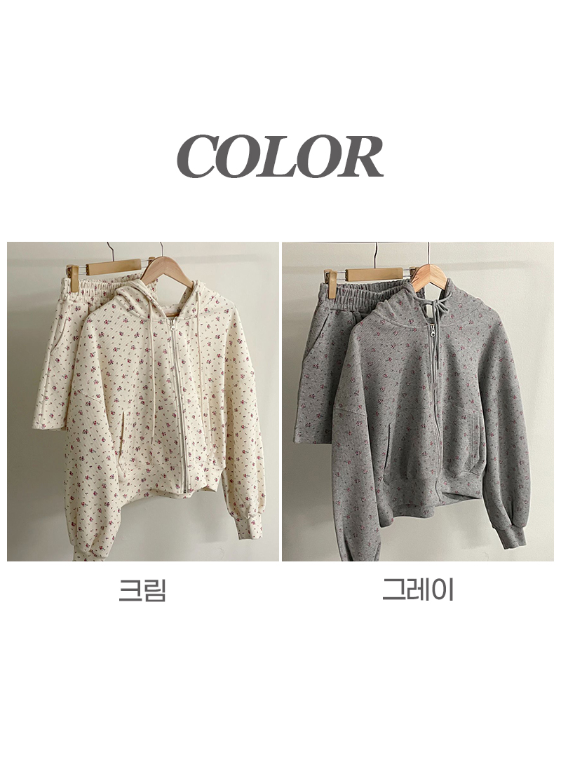 SIZE후드집업Free : 가슴 116~ / 소매 51 / 총길이 57 cm팬츠Free 55 : 허리(밴딩) 58~ / 총길이 40 cmFABRIC폴리, 스판신축성보통 / 두께감보통 / 비침없음초반 드라이클리닝 권장