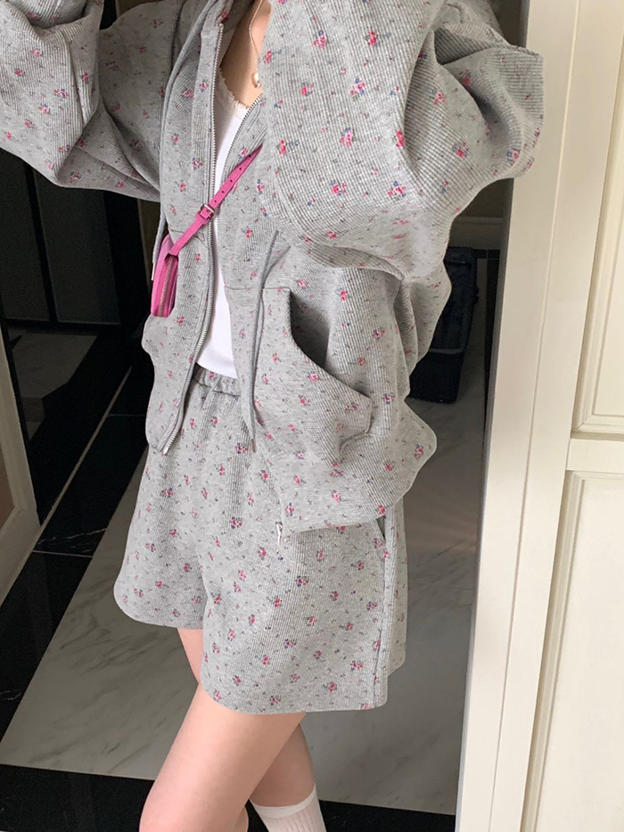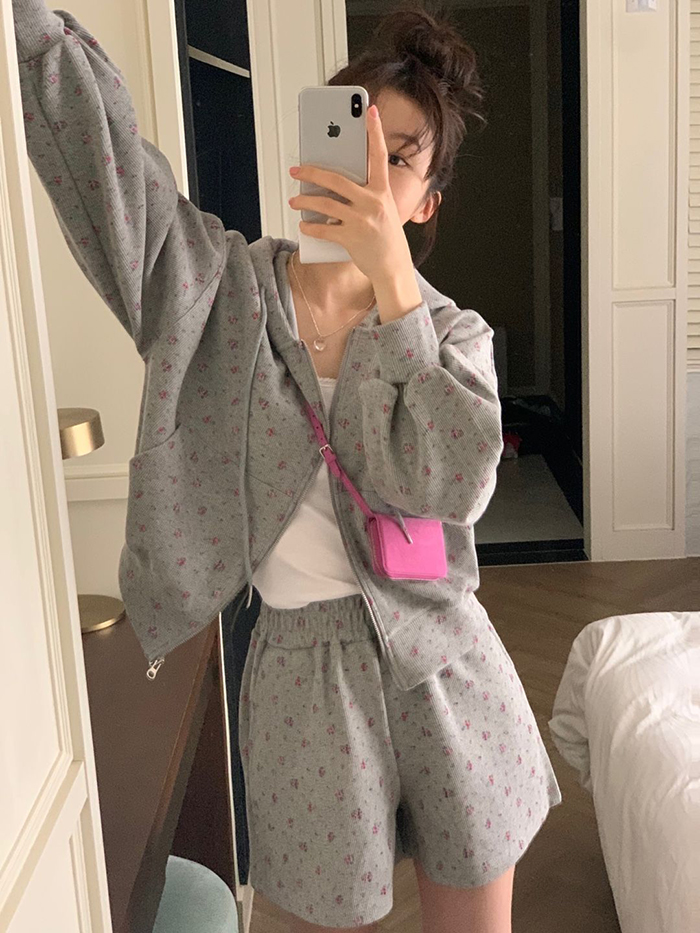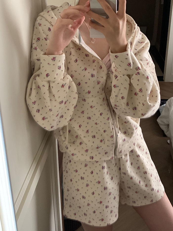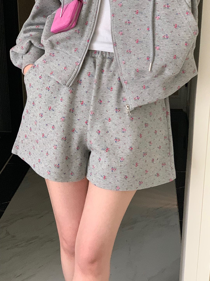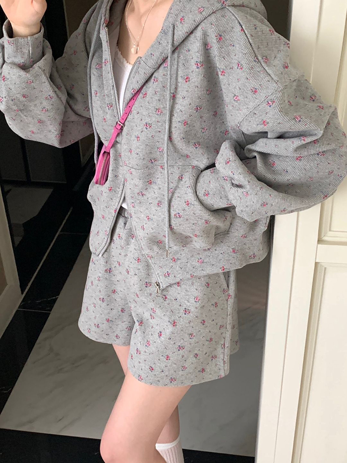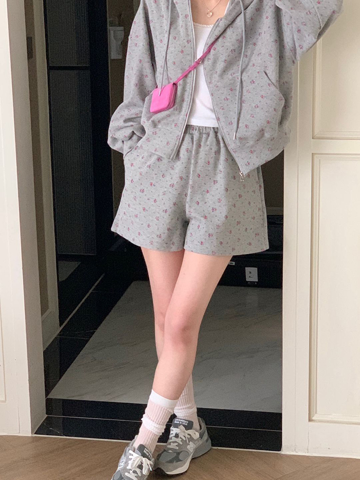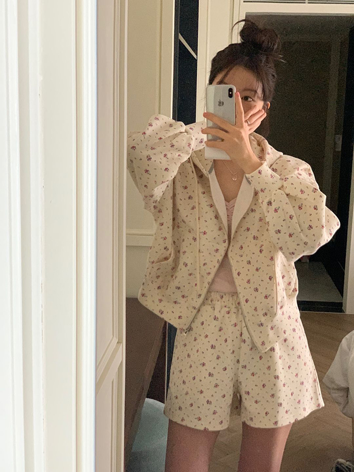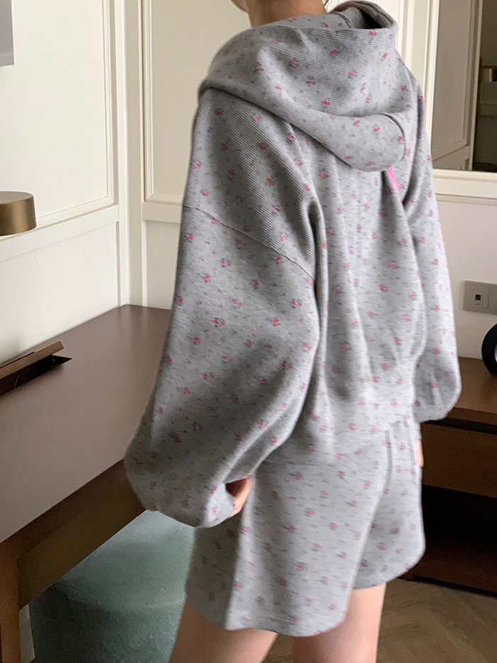 SIZE후드집업Free : 가슴 116~ / 소매 51 / 총길이 57 cm팬츠Free 55 : 허리(밴딩) 58~ / 총길이 40 cmFABRIC폴리, 스판신축성보통 / 두께감보통 / 비침없음초반 드라이클리닝 권장