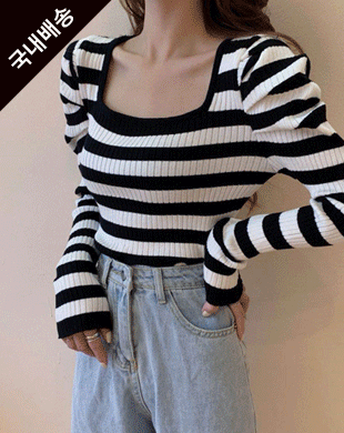굿모닝 볼륨소매 스퀘어넥 골지 니트 티셔츠
