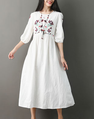 모랑 꽃자수 볼륨소매 린넨 롱원피스