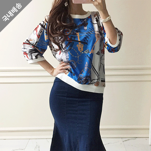 몬첼라토 블루 럭스 패턴 블라우스 티셔츠