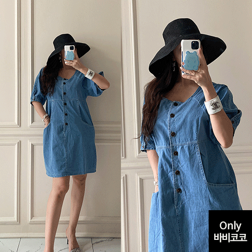 국내배송 / 로모네 볼륨소매 버튼 루즈핏 청 원피스