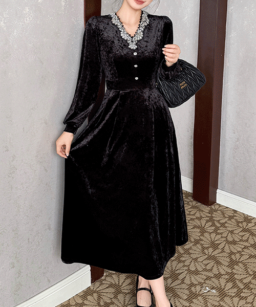 - 로비에나 엘레강스 큐빅 장식 벨벳 플레어 롱 원피스( 리뷰 : 0 )