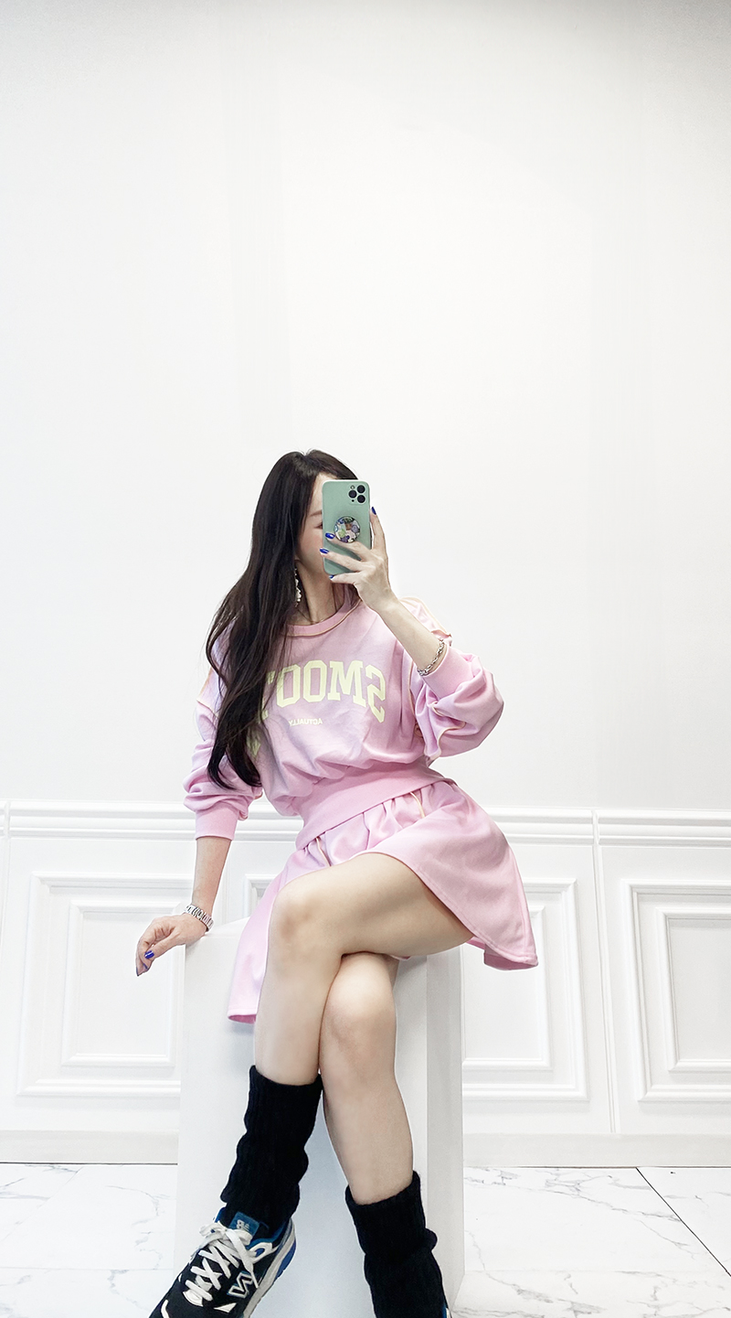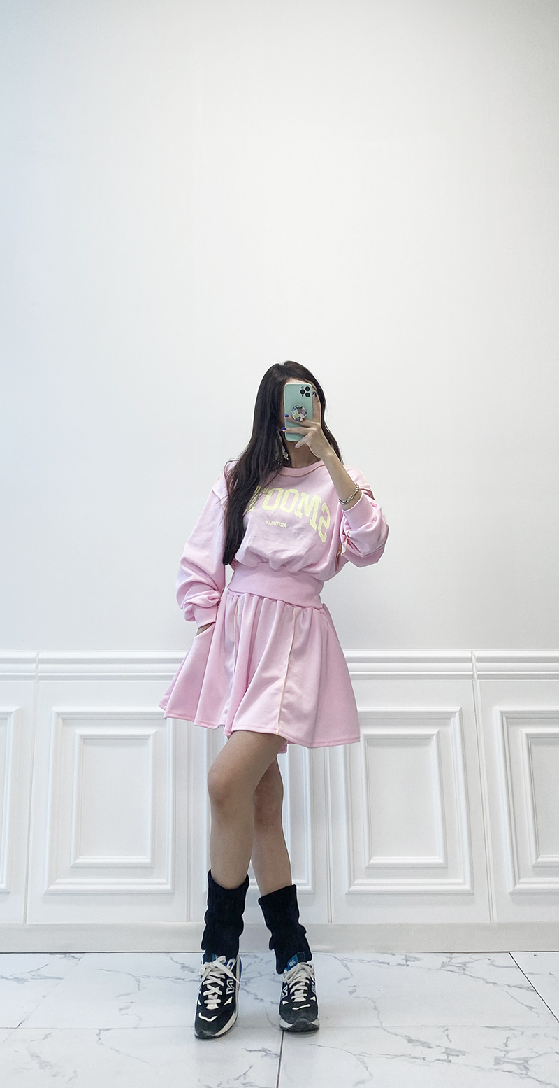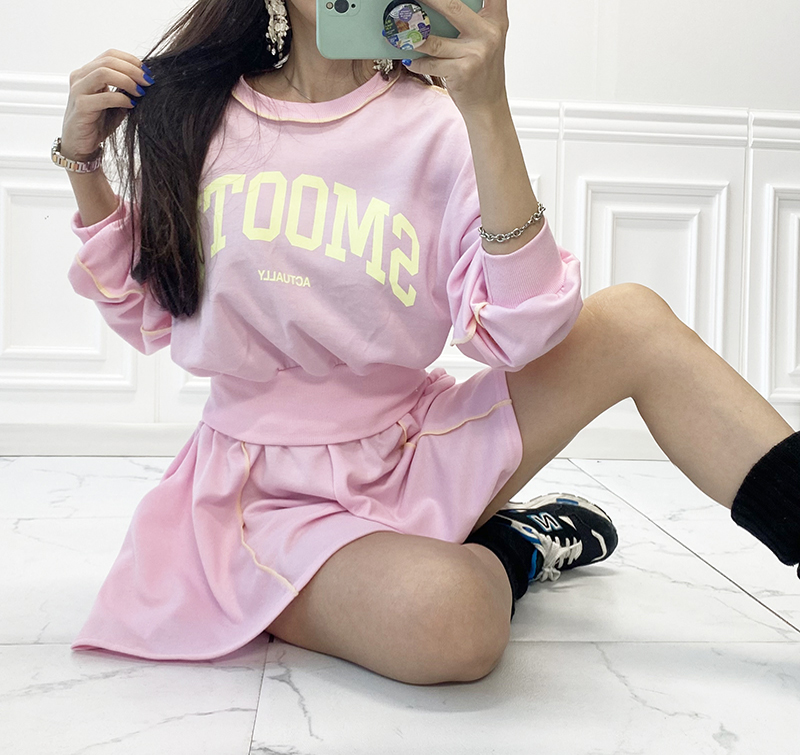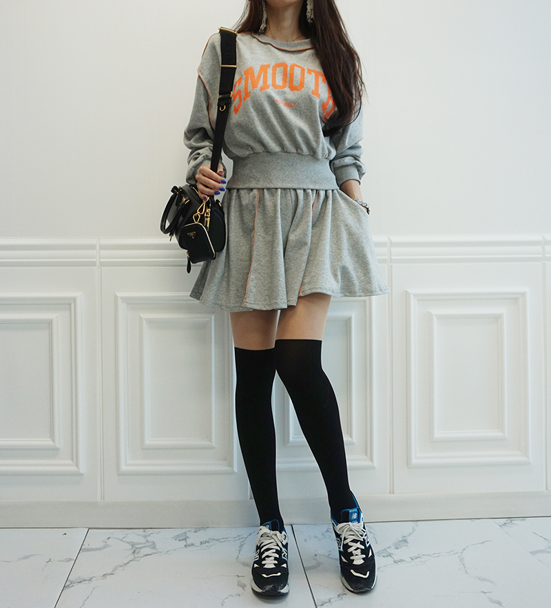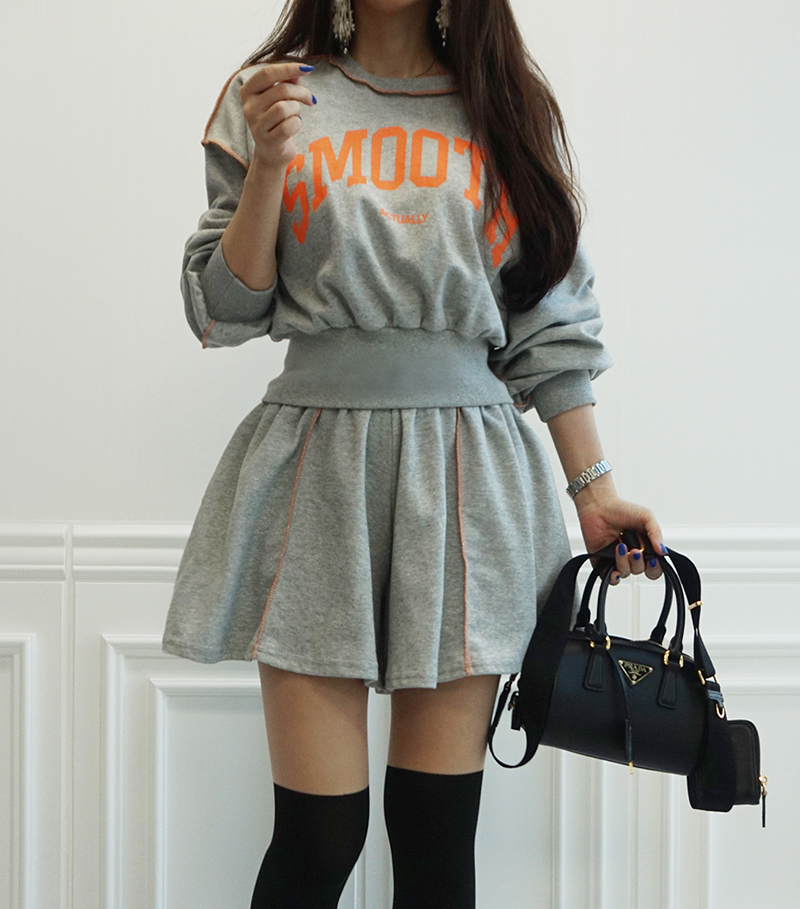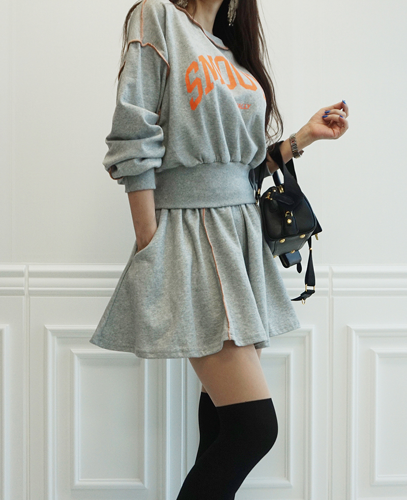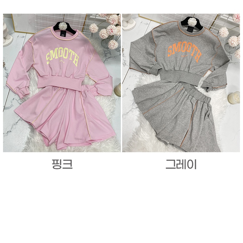 비비드 컬러 레터링 맨투맨 치마바지 세트예요.