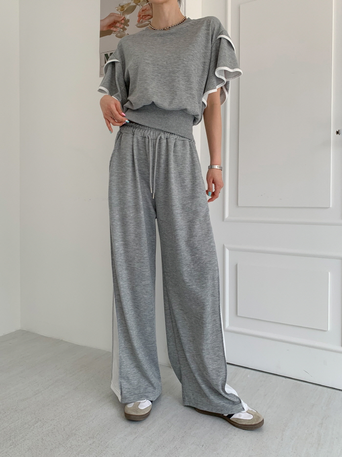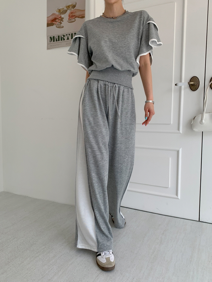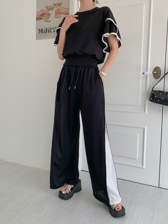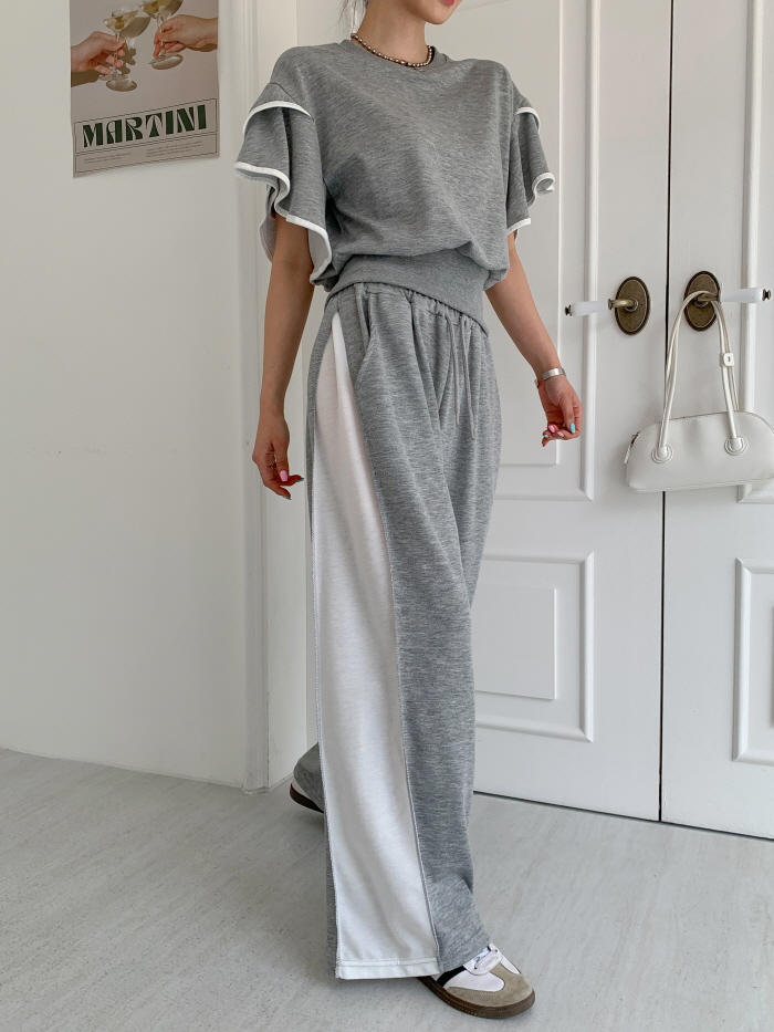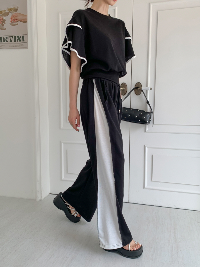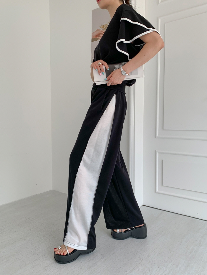 러블리한 프릴 소매와 배색 팬츠 세트로우아하면서도 페미닌한 무드를 연출합니다.