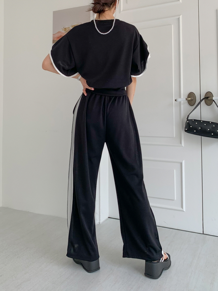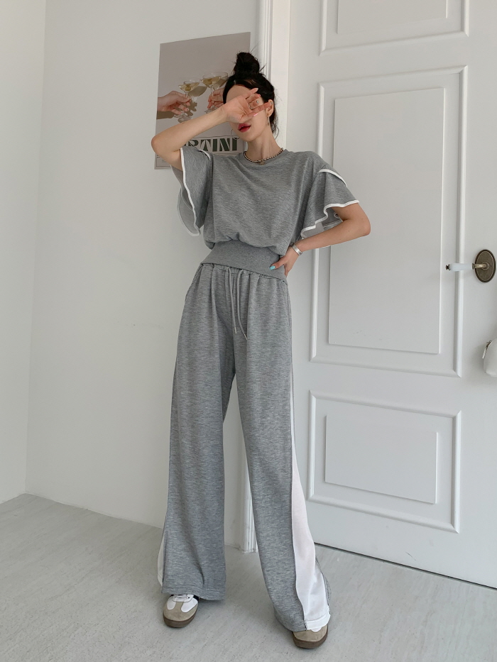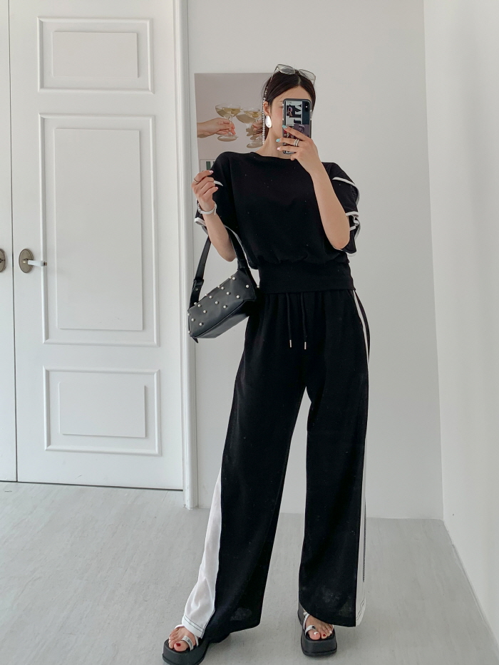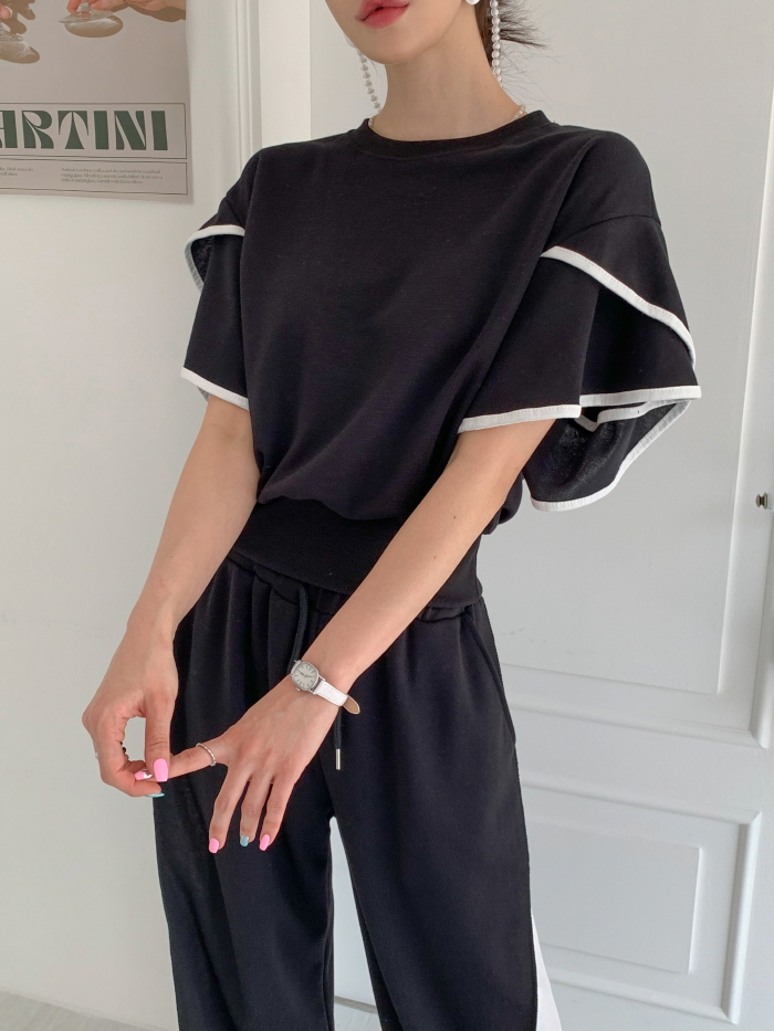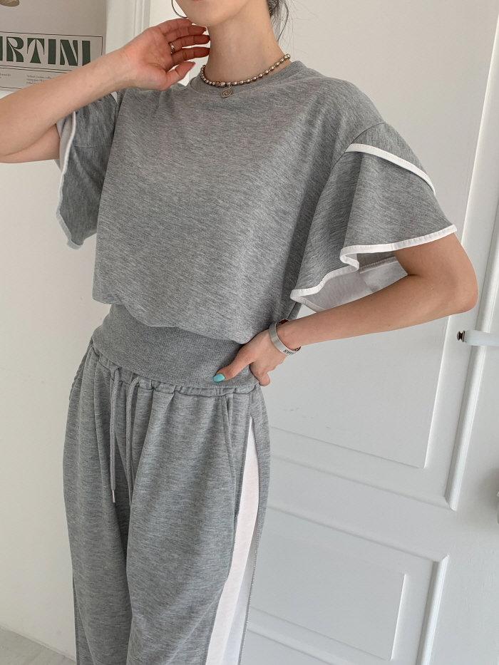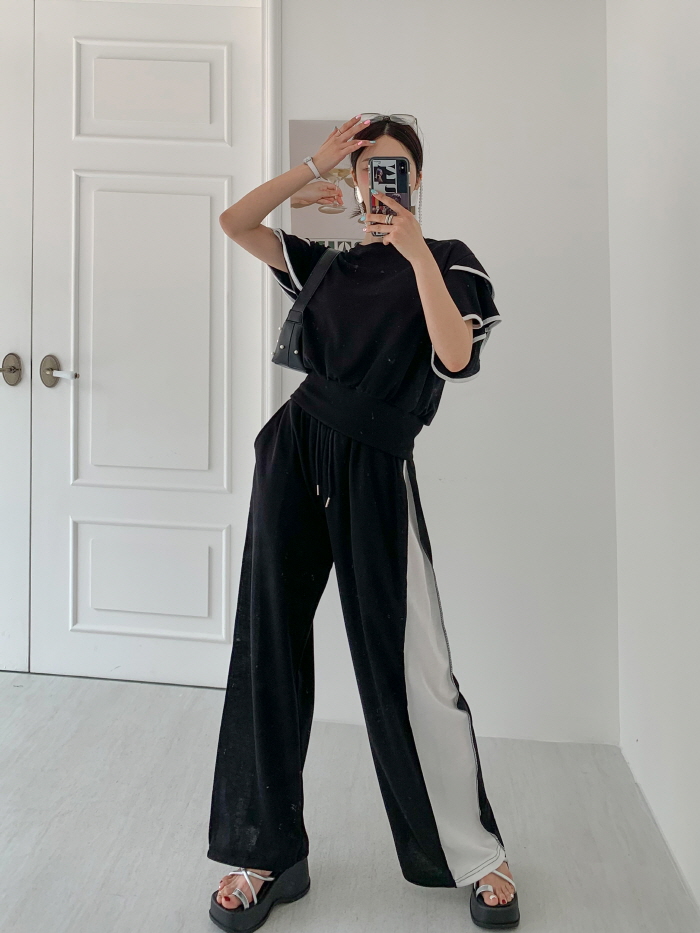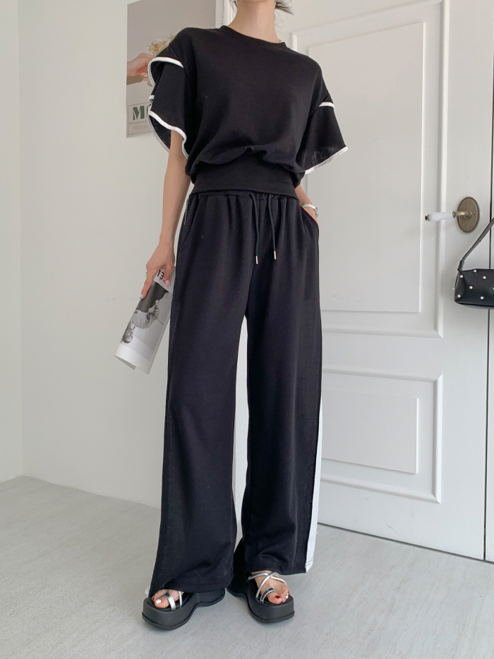 러블리한 프릴 소매와 배색 팬츠 세트로우아하면서도 페미닌한 무드를 연출합니다.