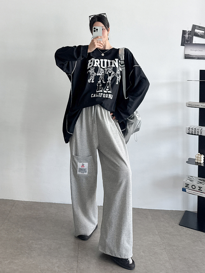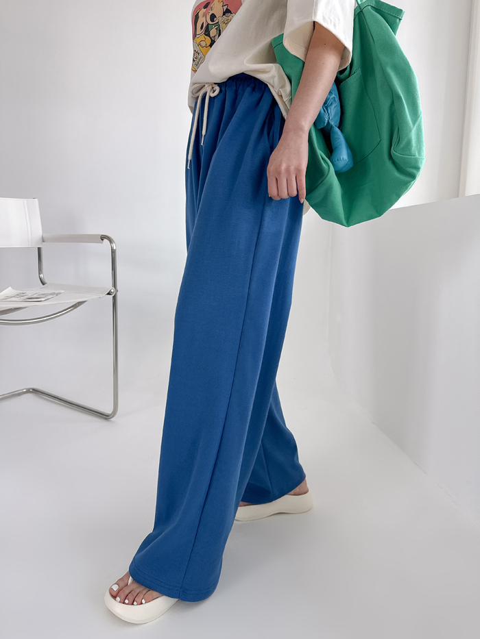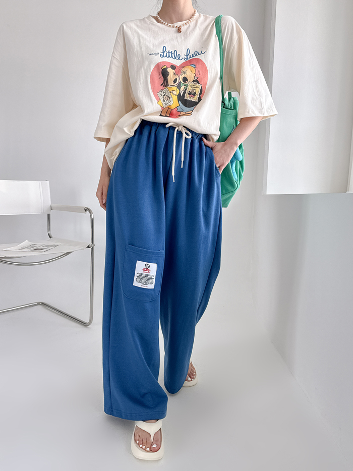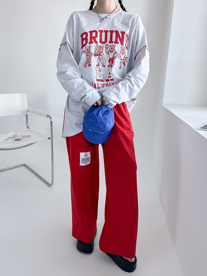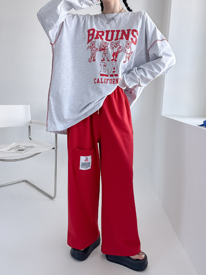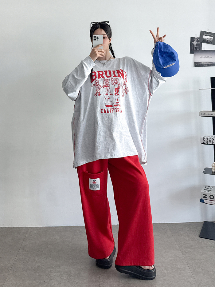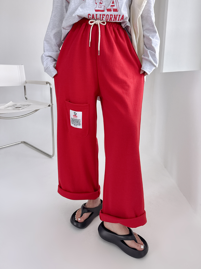 안정감있게 밑위가 길 뿐 아니라짱짱한 허리 밴딩에 여유있는 와이드핏으로 하체를 커버해줘 부담없이 편하게 입기 좋아요.레드 / 블루 / 그레이 / 블랙