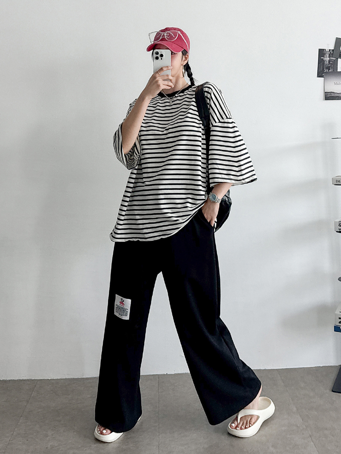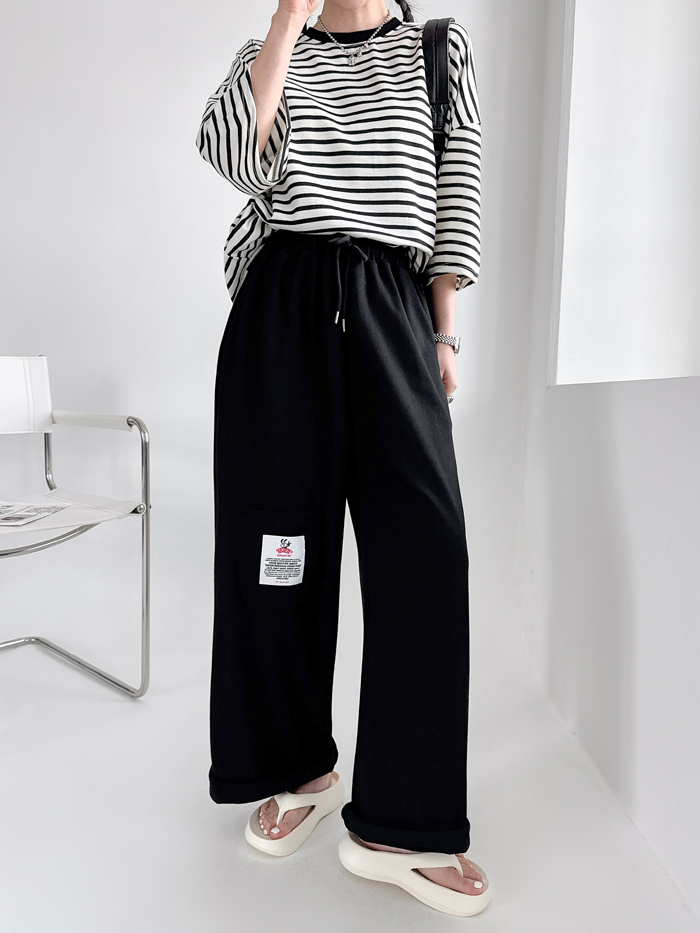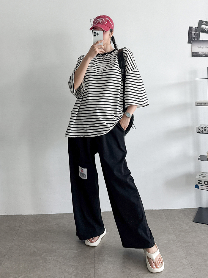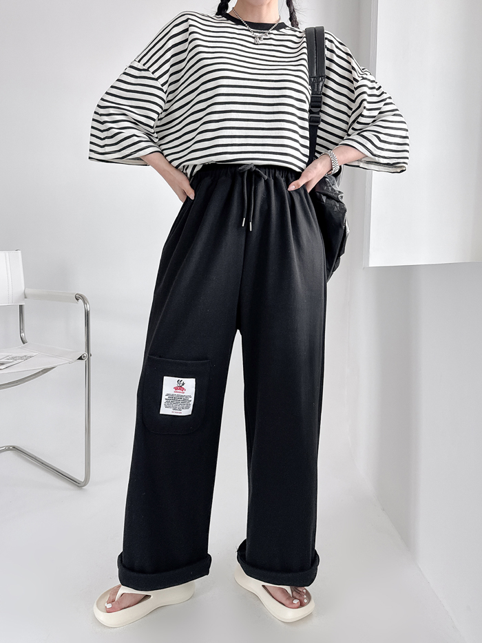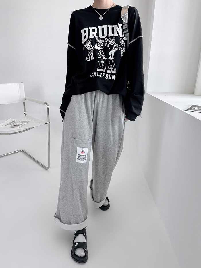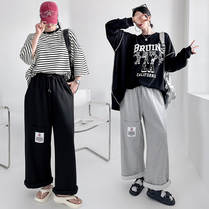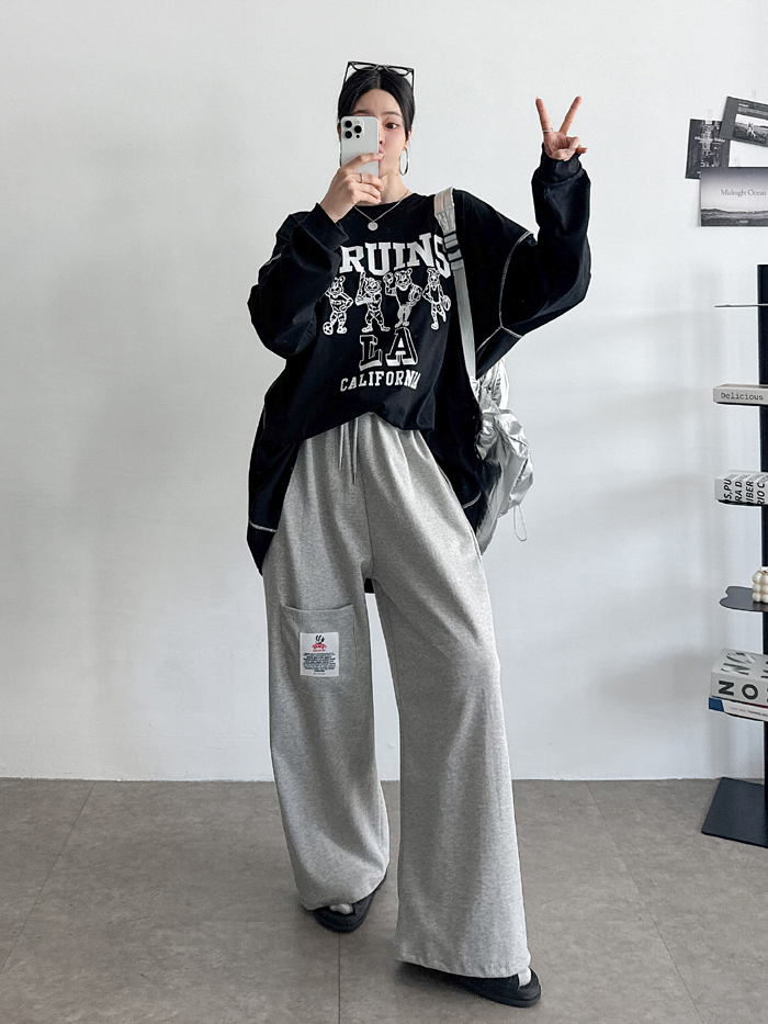 안정감있게 밑위가 길 뿐 아니라짱짱한 허리 밴딩에 여유있는 와이드핏으로 하체를 커버해줘 부담없이 편하게 입기 좋아요.레드 / 블루 / 그레이 / 블랙